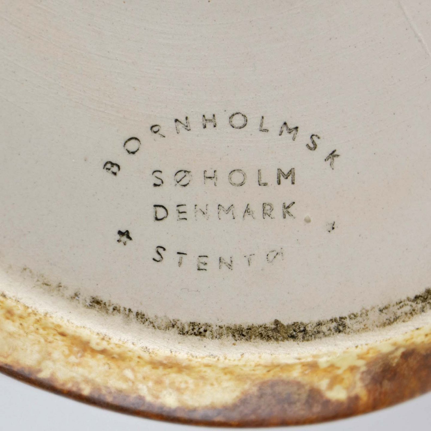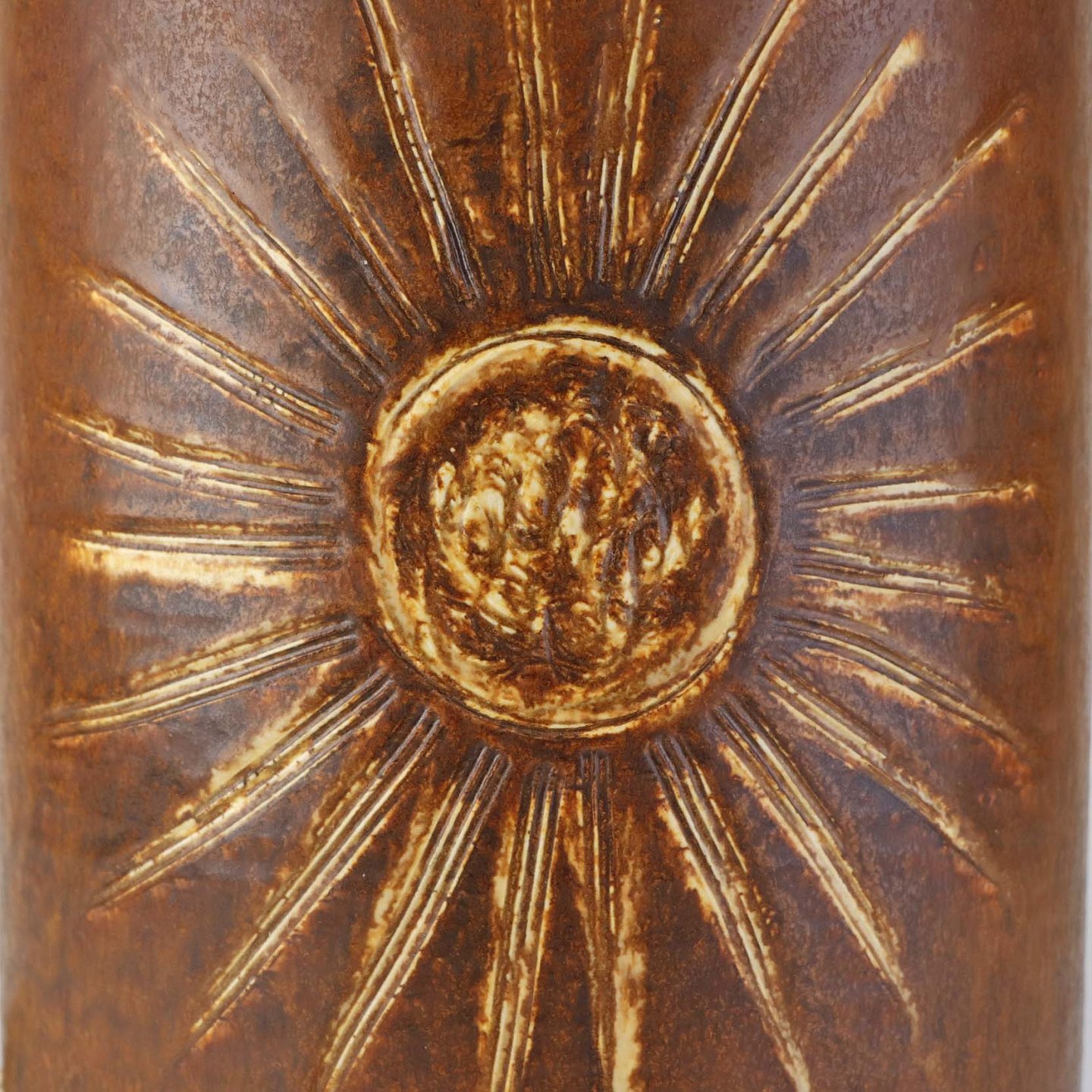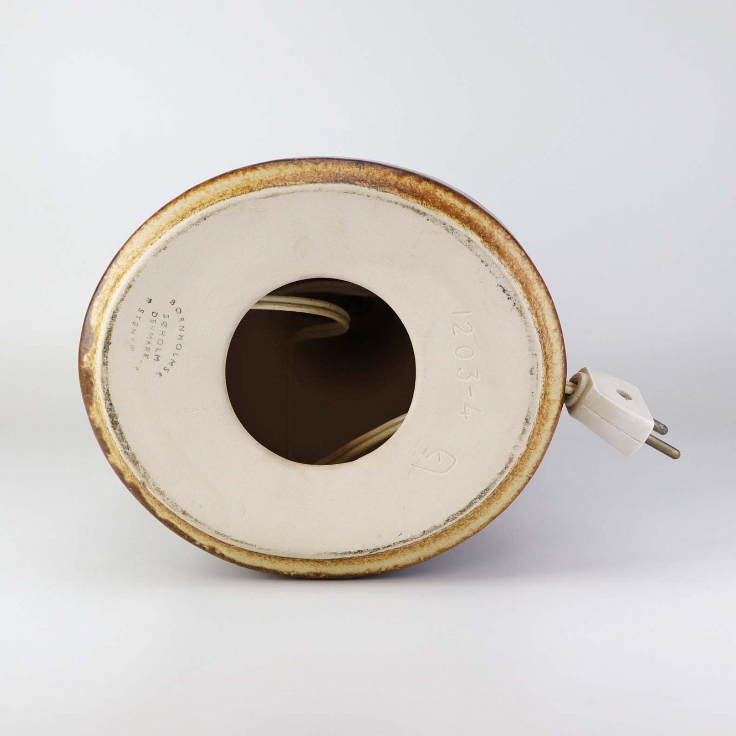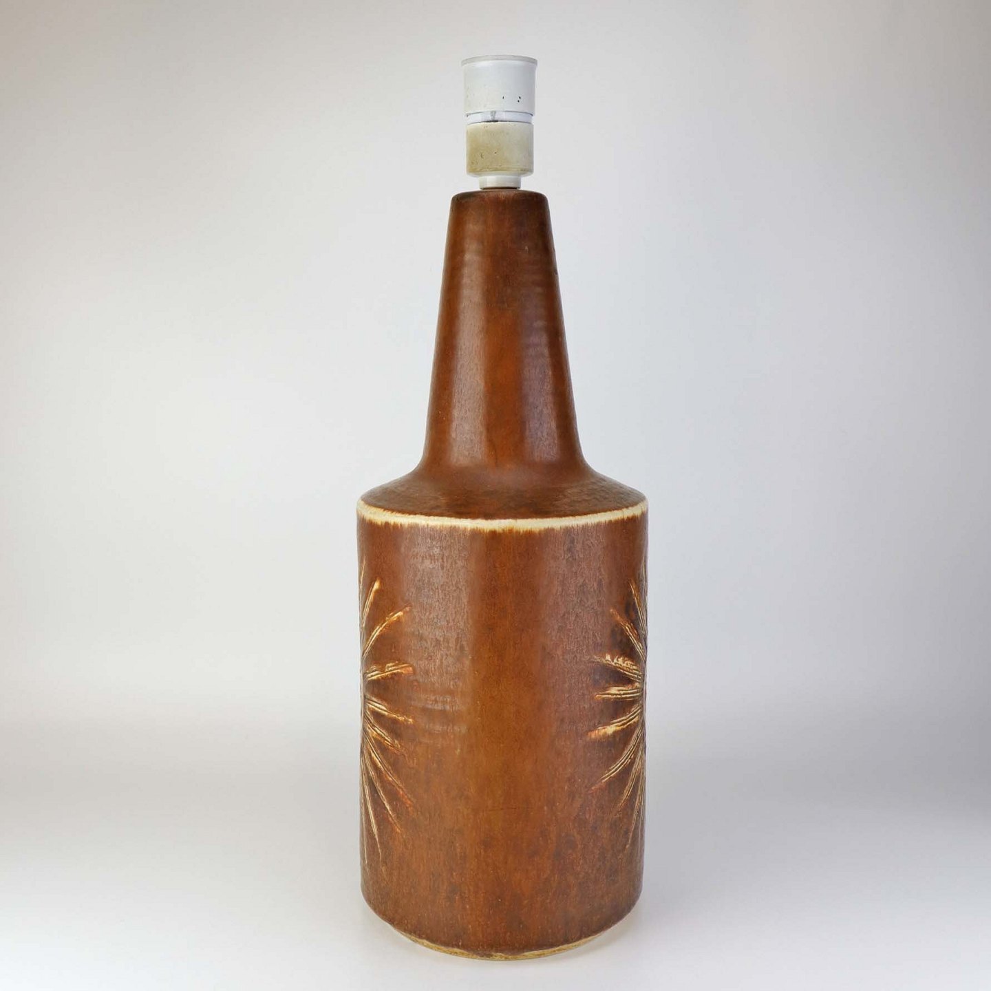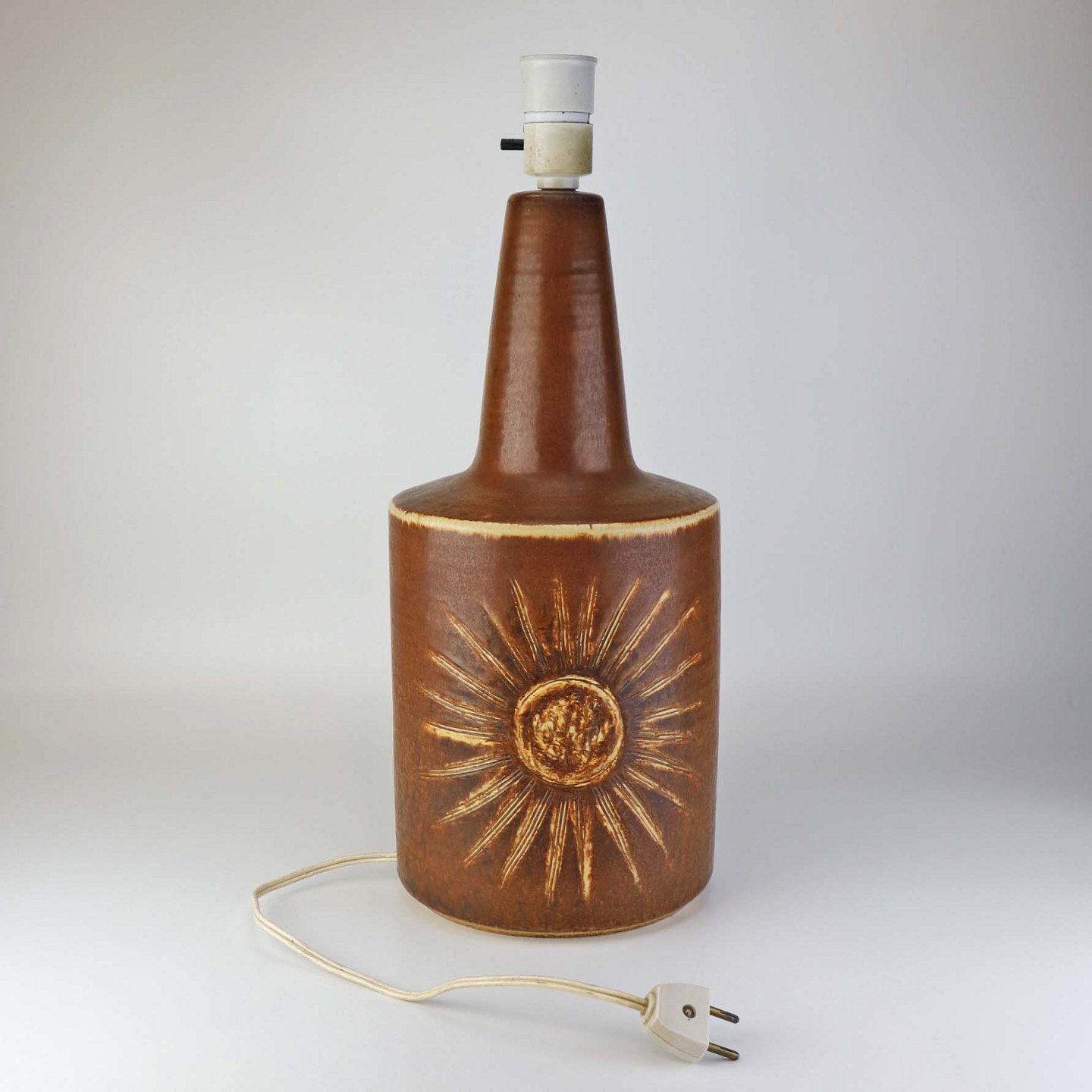 Lampefod i stentøj med gyldenbrun glasur og dekoration af sol. Ledningen er opbevaret i foden. Nr. 1203-4