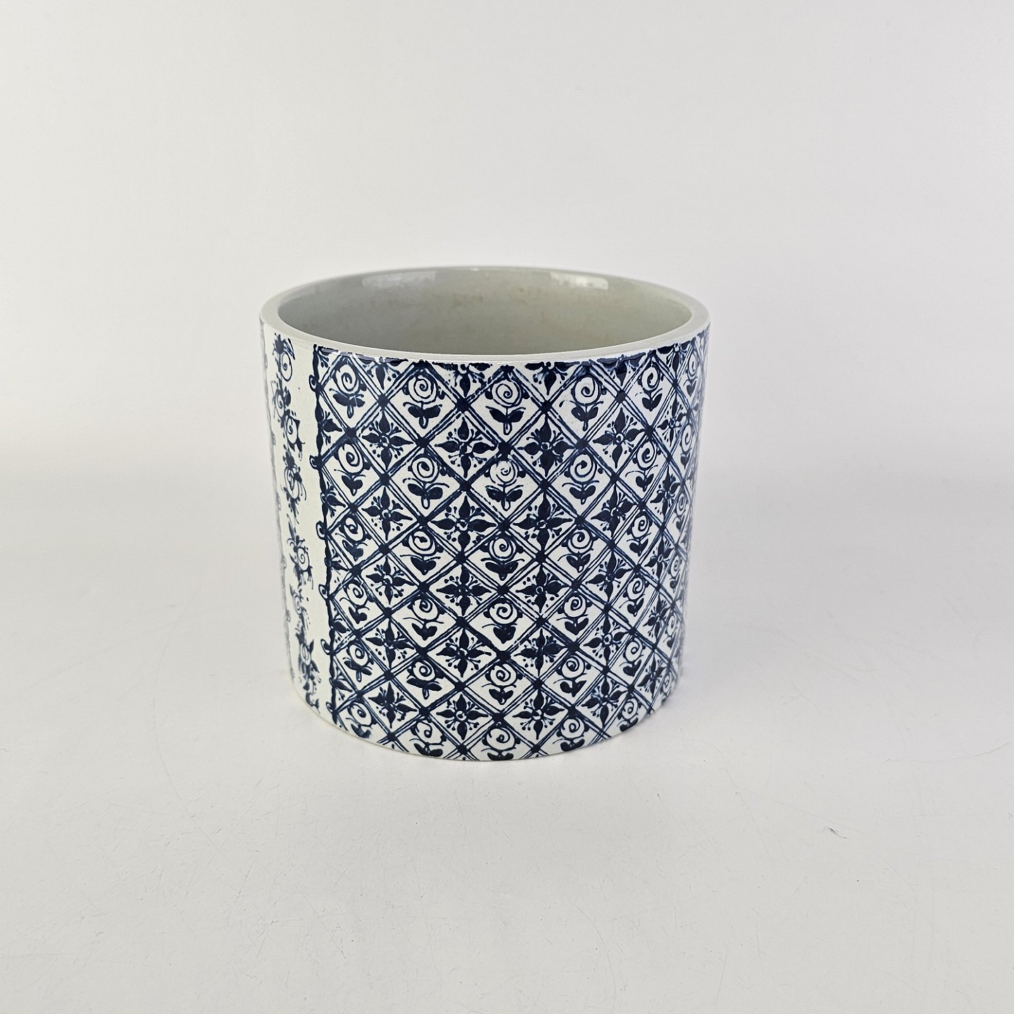 Urtepotteskjuler af porcelæn med et sort/hvidt mønster af en kvinde og blomster og teksten Koleriker