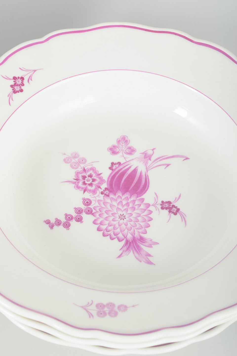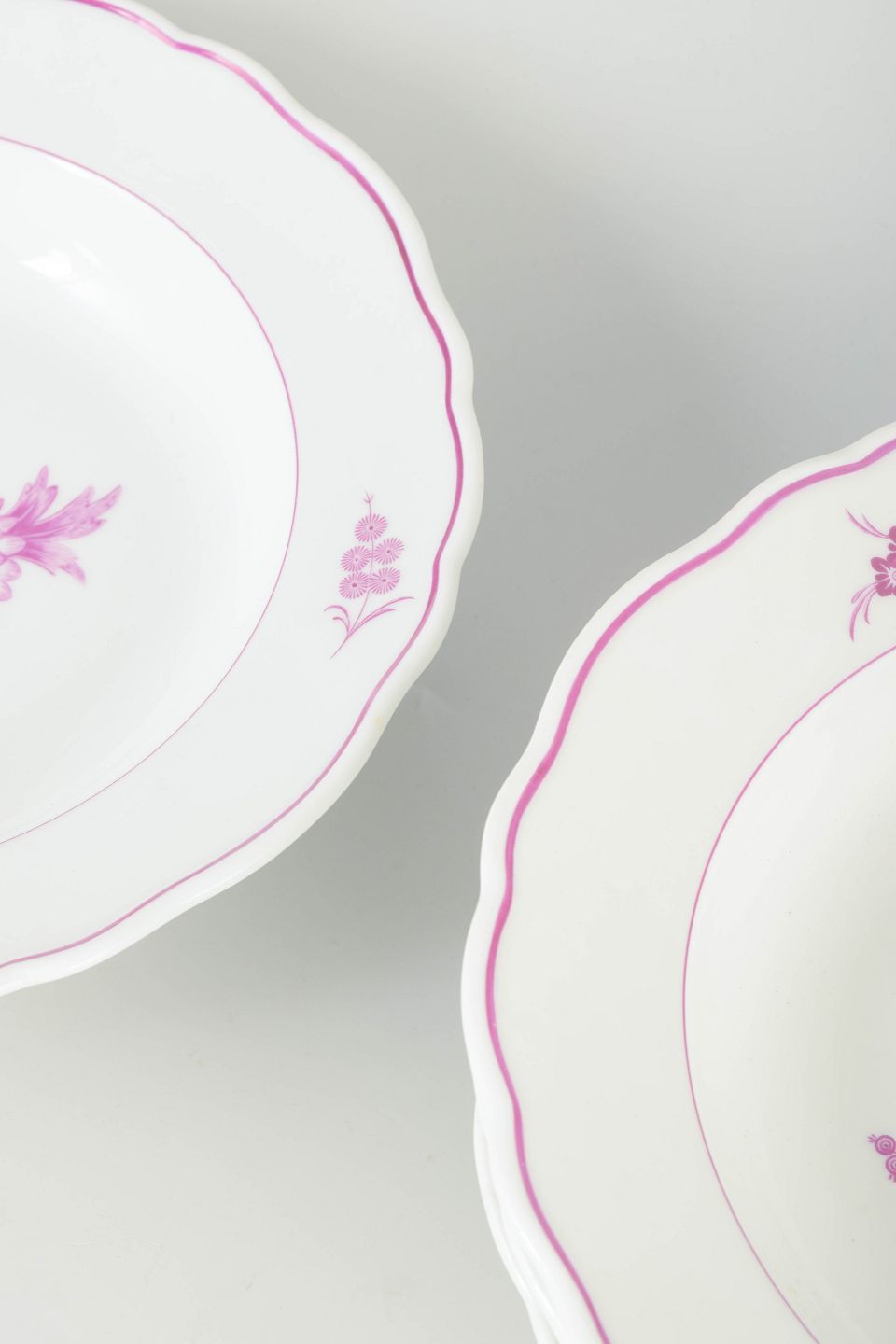 Sæt af fire dybe tallerkener i porcelæn, håndmalet med dekor i lilla/rosa blomsterkompositioner. Klassiske svungne former med enkel staffering.