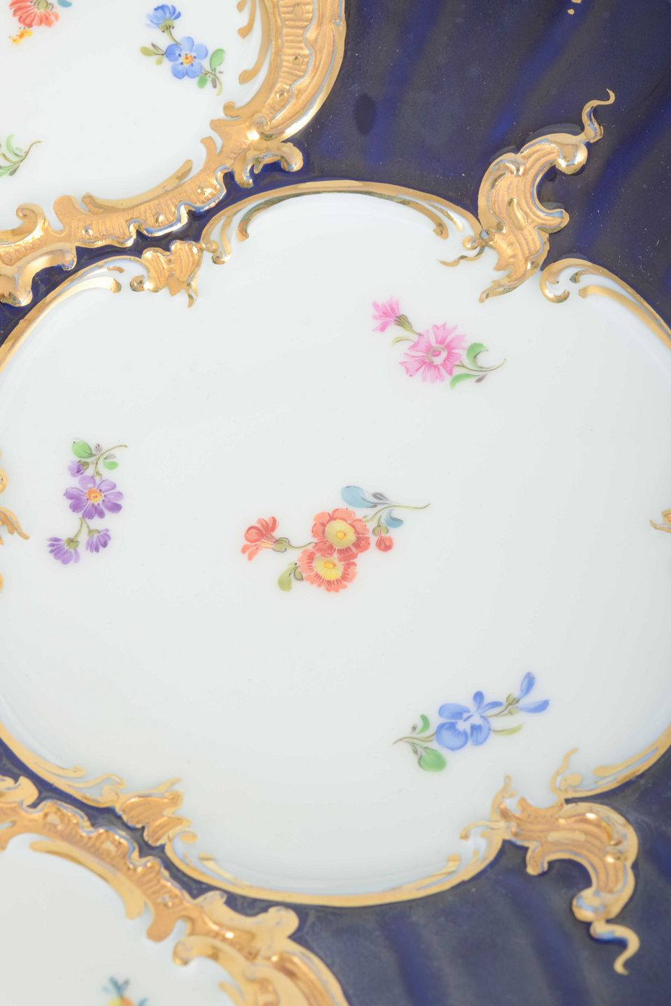 Porcelænsfad med svungne kanter, koboltblå glasur, håndmalede blomsterdekorationer samt rigt håndmalet guldbemaling. Første sortering. Perfekt stand.