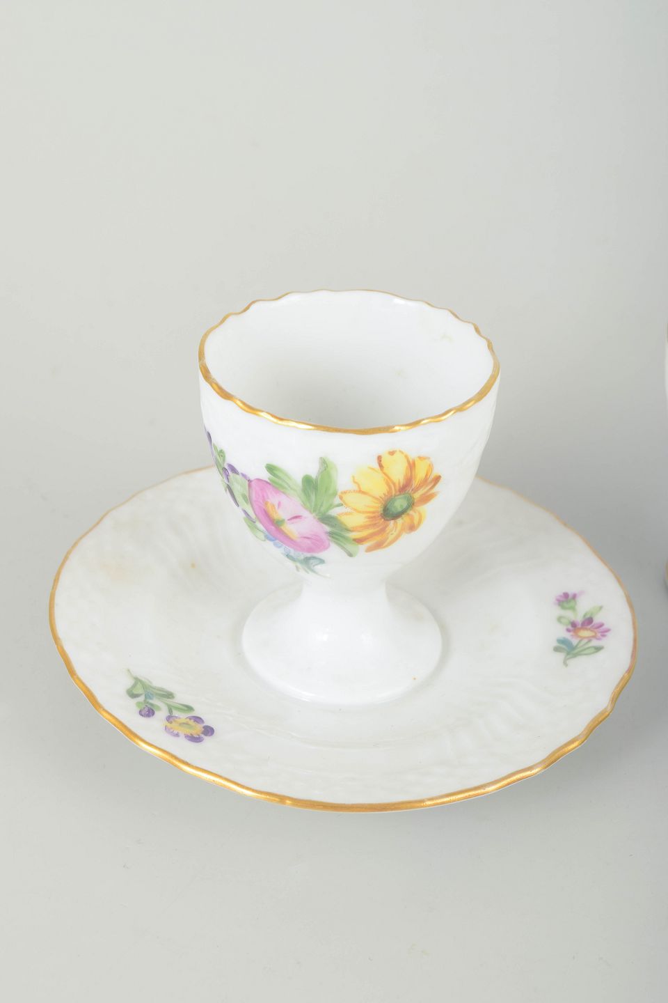 Tre æggebægre i porcelæn, heraf to på fastmonterede underkopper, dekoreret med håndmalede blomster i det klassiske “Sachsisk Blomst” mønster og guldkant.
