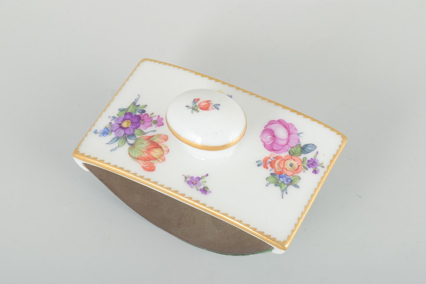 Porcelæns blæksuger med håndmalede blomster i det klassiske “Sachsisk Blomst” mønster, guldkant og knopformet håndtag.