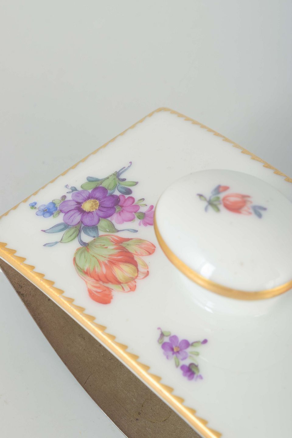 Royal Copenhagen blev grundlagt i 1775 under beskyttelse af Dronning Juliane Marie og er kendt for sine håndmalede porcelænsserier. “Sachsisk Blomst” blev introduceret i slutningen af 1700-tallet, inspireret af samtidens botaniske stik. Serien forblev populær gennem 1800- og 1900-tallet, og unikke genstande som skrivebordstilbehør hører til de mere sjældne og eftertragtede samlerobjekter.