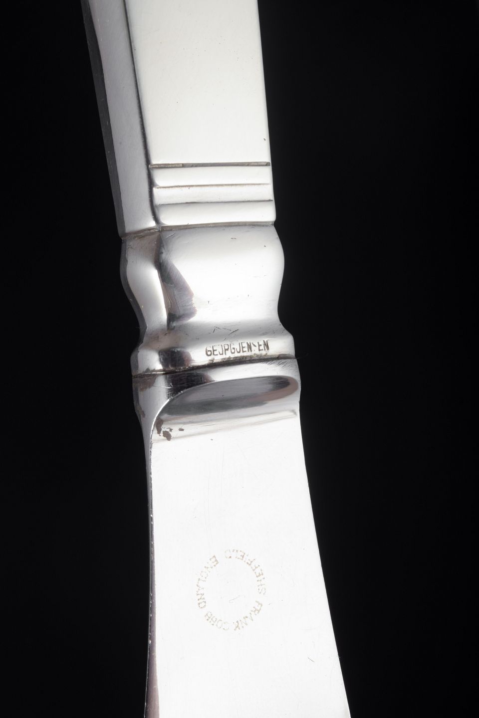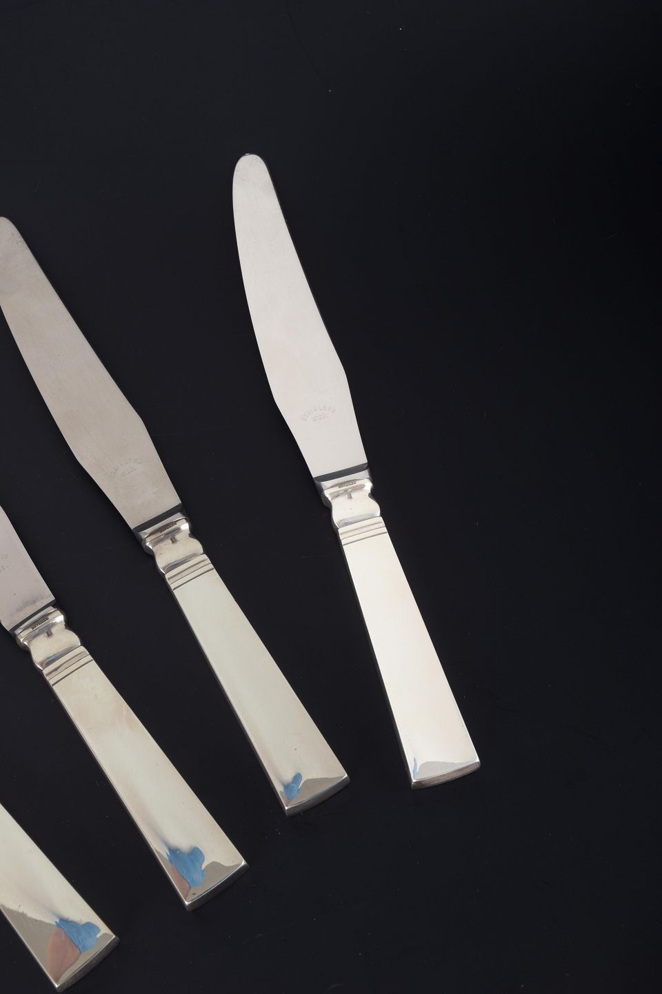 Sæt bestående af 4 middagsknive i det elegante “Blok / Acadia”-mønster, designet af Harald Nielsen i 1918. Knivene har sterlingsølvskafter kombineret med lange klinger i rustfrit stål. Designet er et klassisk eksempel på Art Deco-stilen med funktionalistiske linjer og geometriske proportioner.
