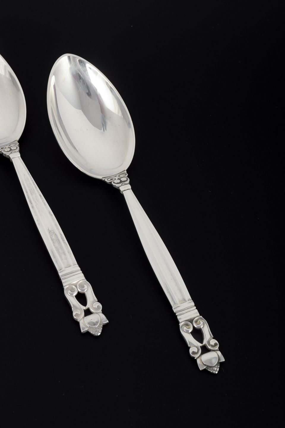 Sæt bestående af 5 dessertskeer i det klassiske “Konge / Acorn”-mønster, designet af Johan Rohde i 1915. Elegant udført med skaft dekoreret af akantusblad og agernmotiv.