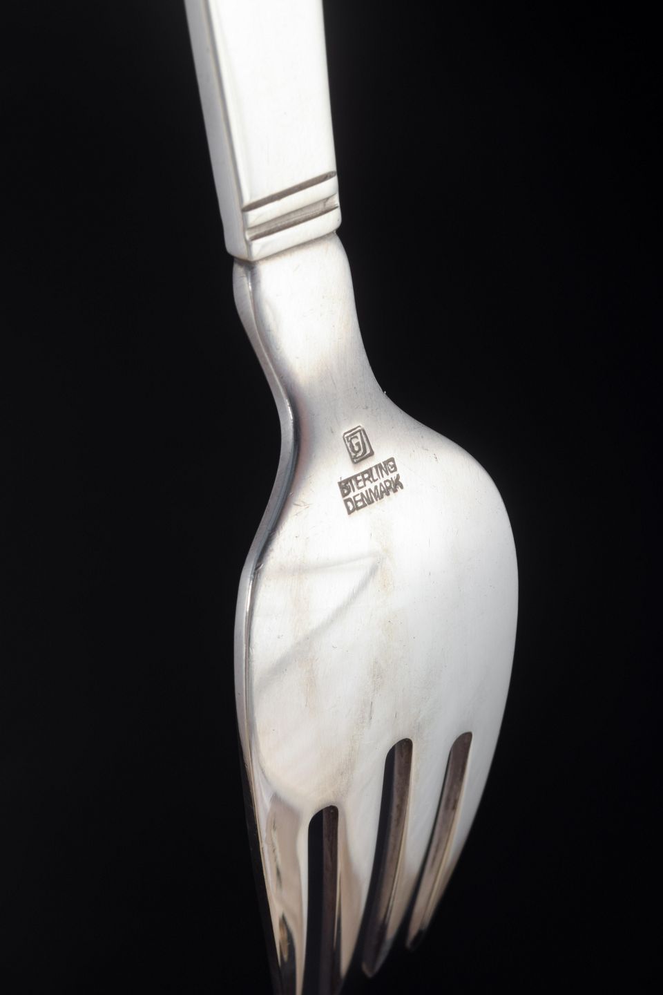 Sæt bestående af 8 dele fiskebestik til 4 personer i det elegante “Blok / Acadia”-mønster, designet af Harald Nielsen i 1918. Hver kuvert består af en fiskekniv og en fiskegaffel. Mønstret er karakteriseret ved en stram, funktionalistisk formgivning med glatte flader og geometriske proportioner.