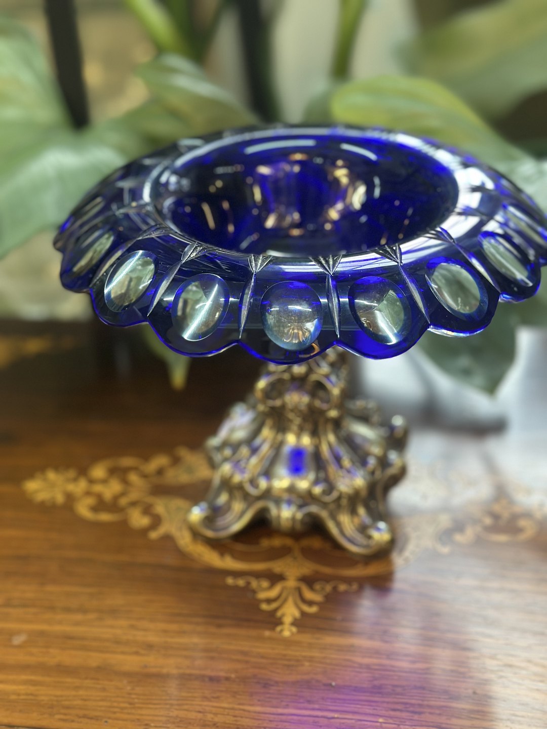 Bohemia Rund skål med bølget kant og stor åbning monteret på en ornamenteret metalfod i baroksstill .sølvplet med dekorerede akantusblade og svungne fødder