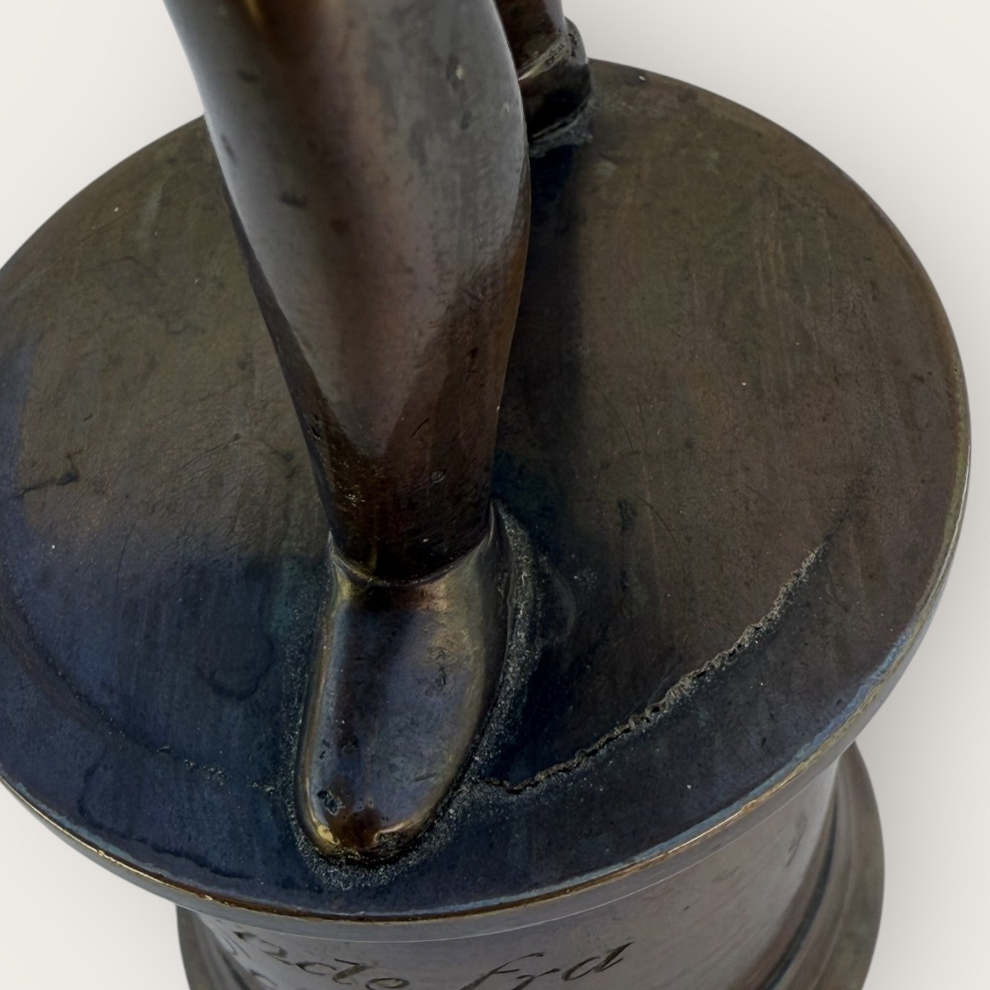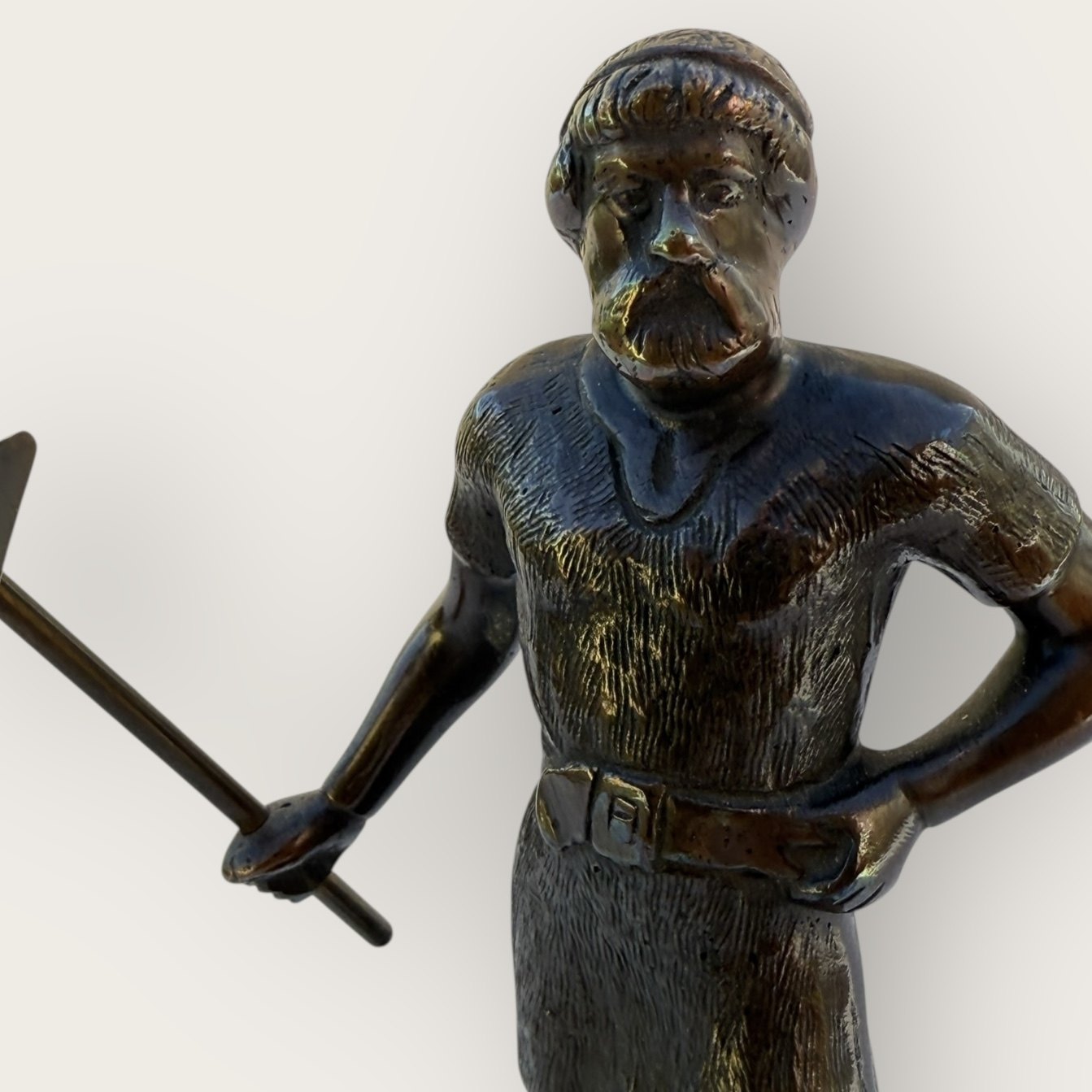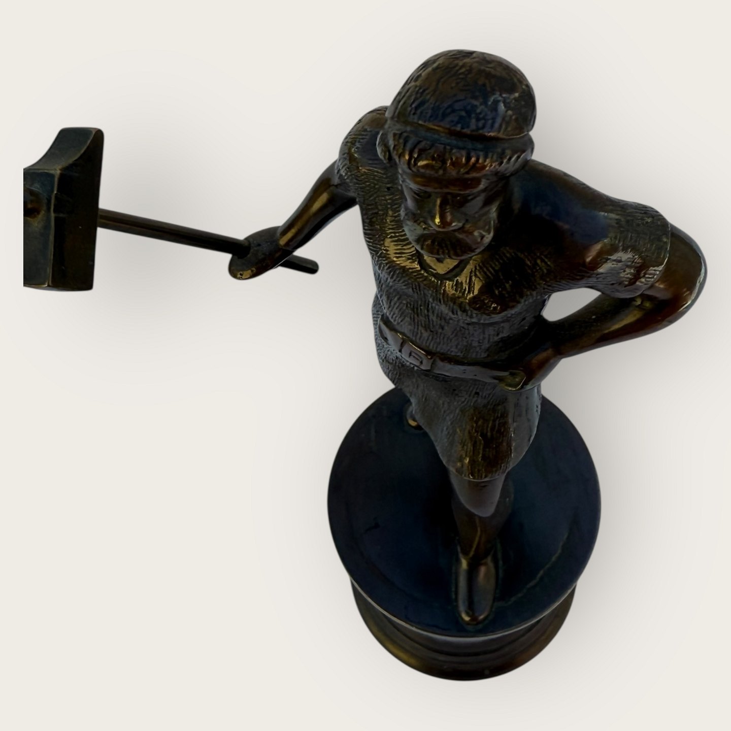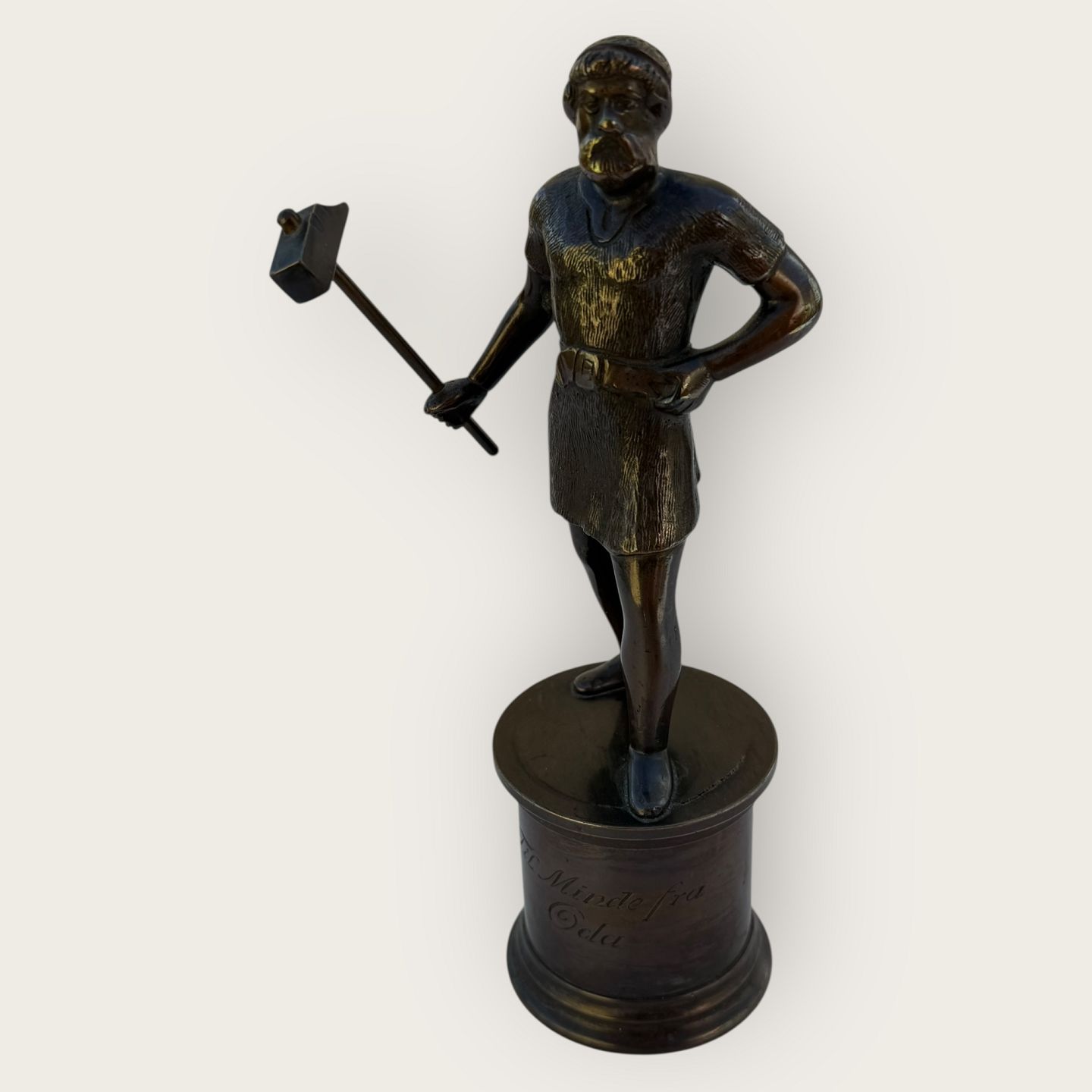 Bronze figur af Guden Thor med sin hammer, lille sprække i soklen ved hans fod (se foto) ellers pæn stand, indgraveret: Til minde om Oda, Højde 19cm