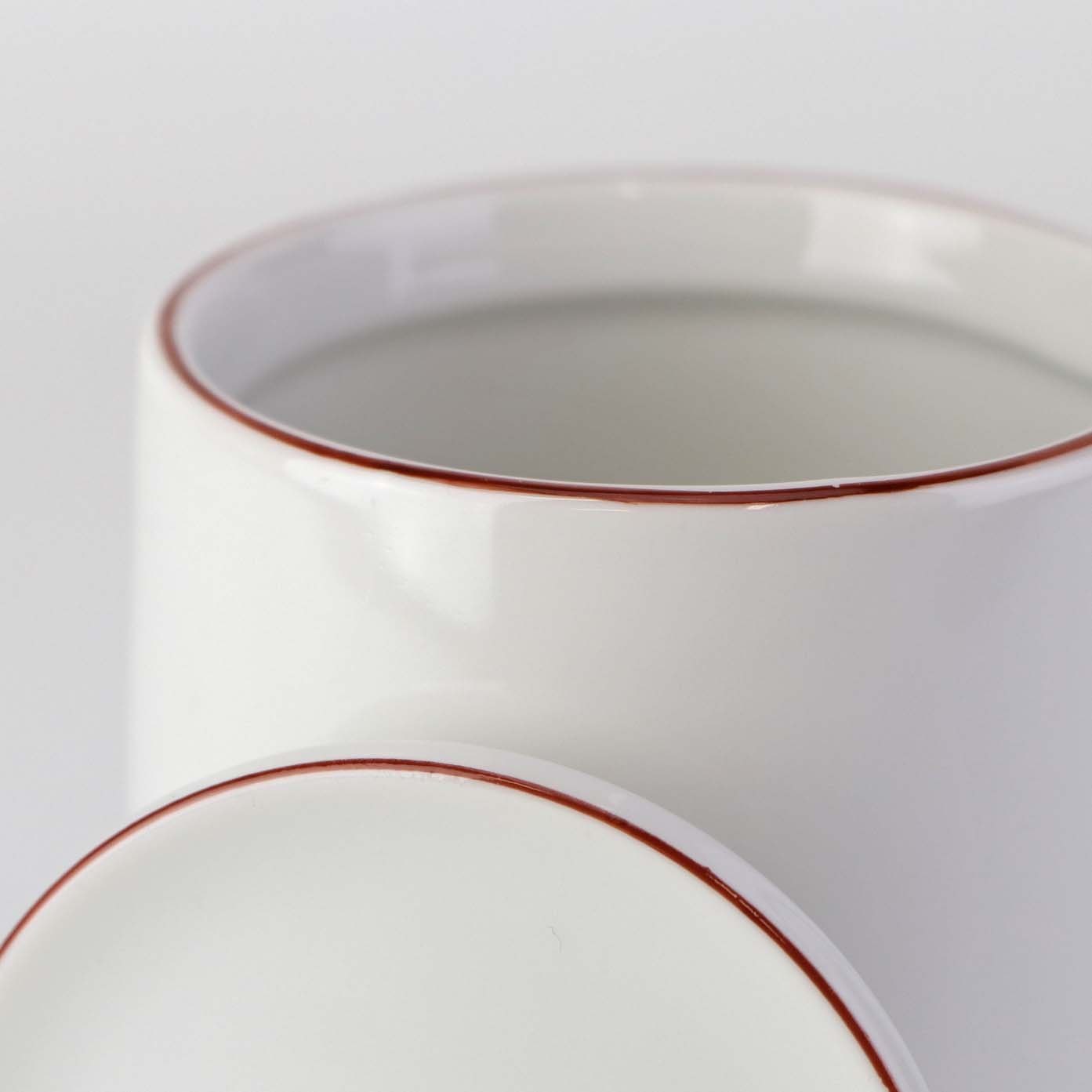Service i glat hvidt porcelæn med dekoration i tynd rød streg.