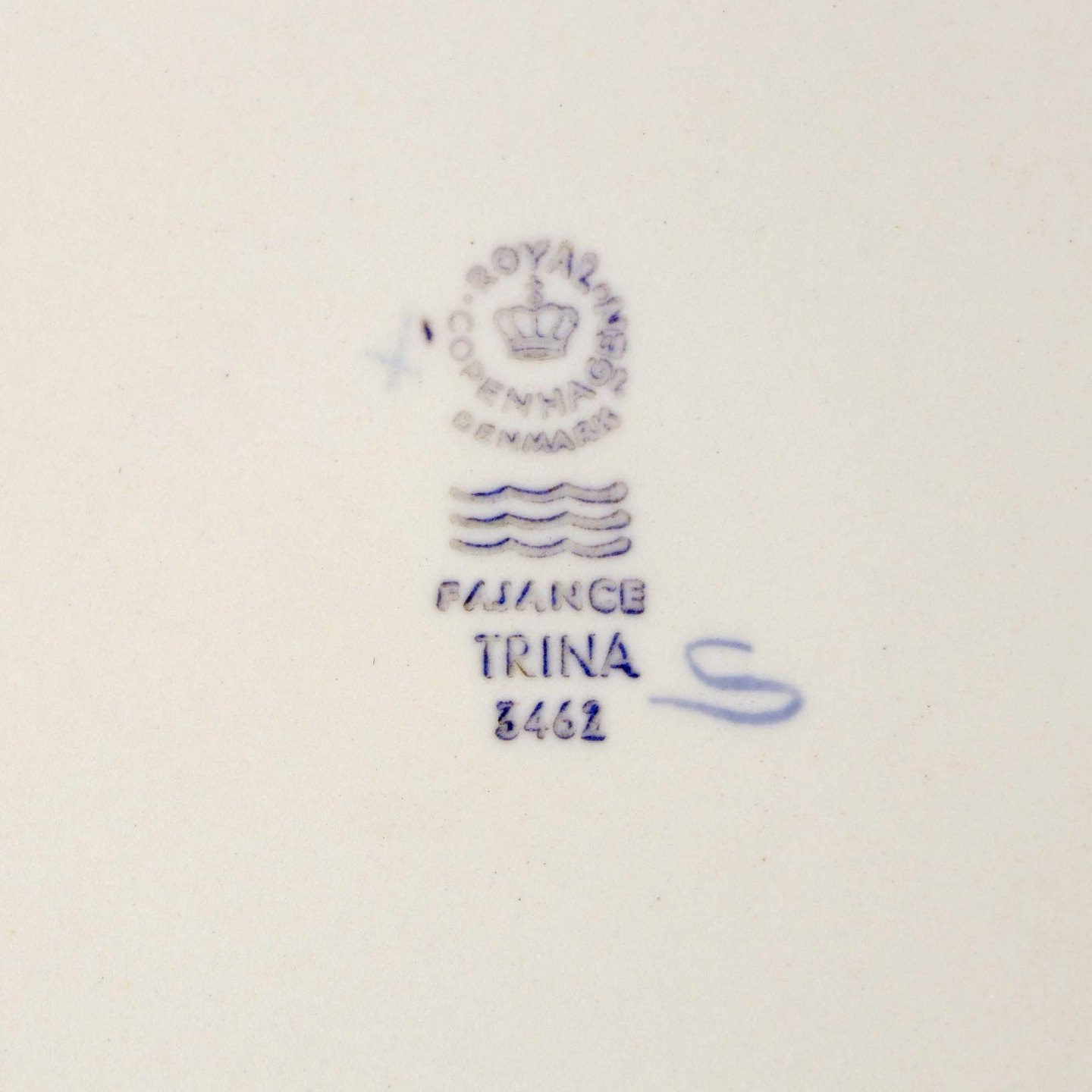 Middagstallerken i kongelig fajance fra stellet Blå Trina. Nr. 3462
