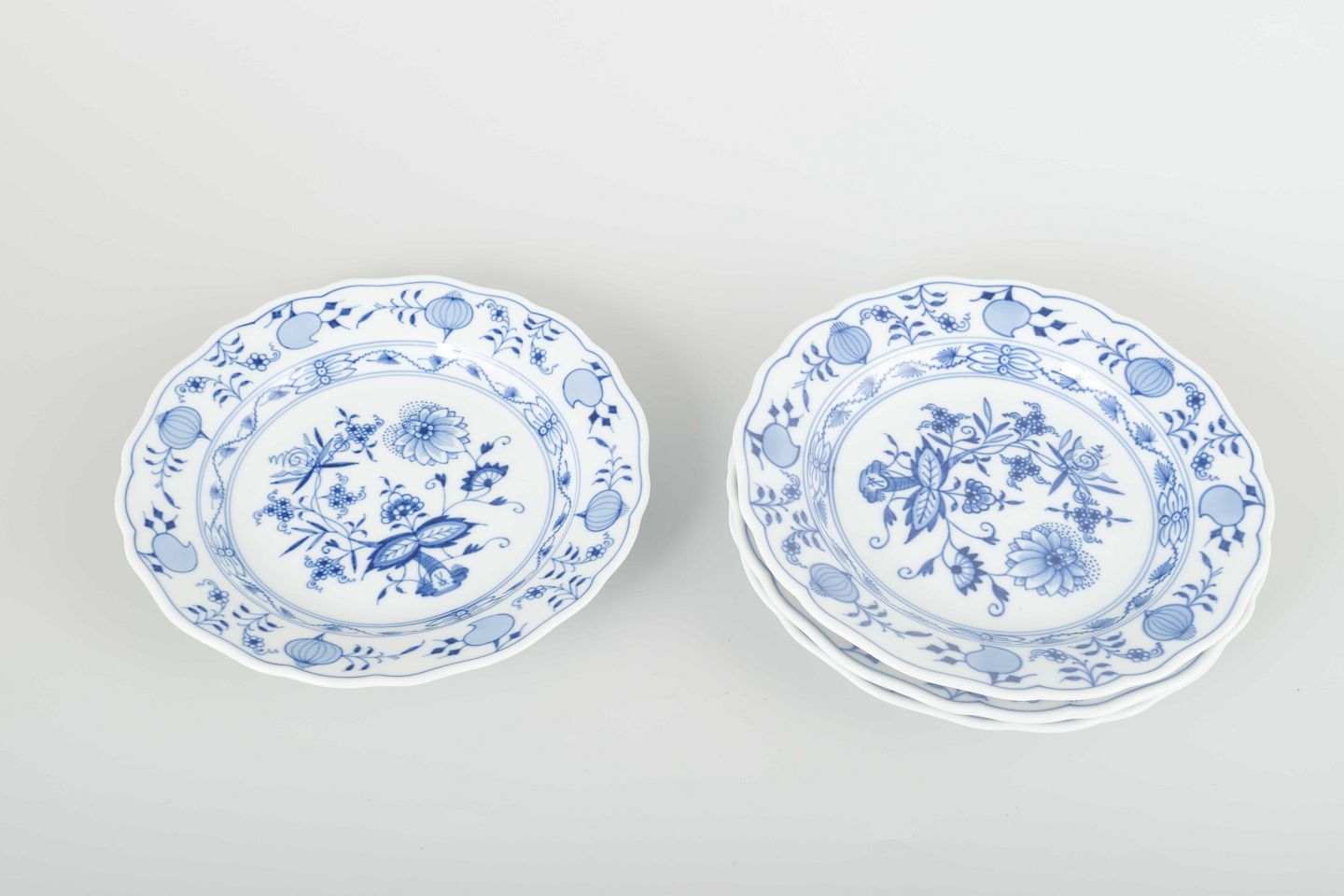 Fire håndmalede porcelænstallerkener i det klassiske “Løgmønstret” (Blue Onion) mønster. Dekoreret i underglasurblå med bølget kant og elegant ornamentik.