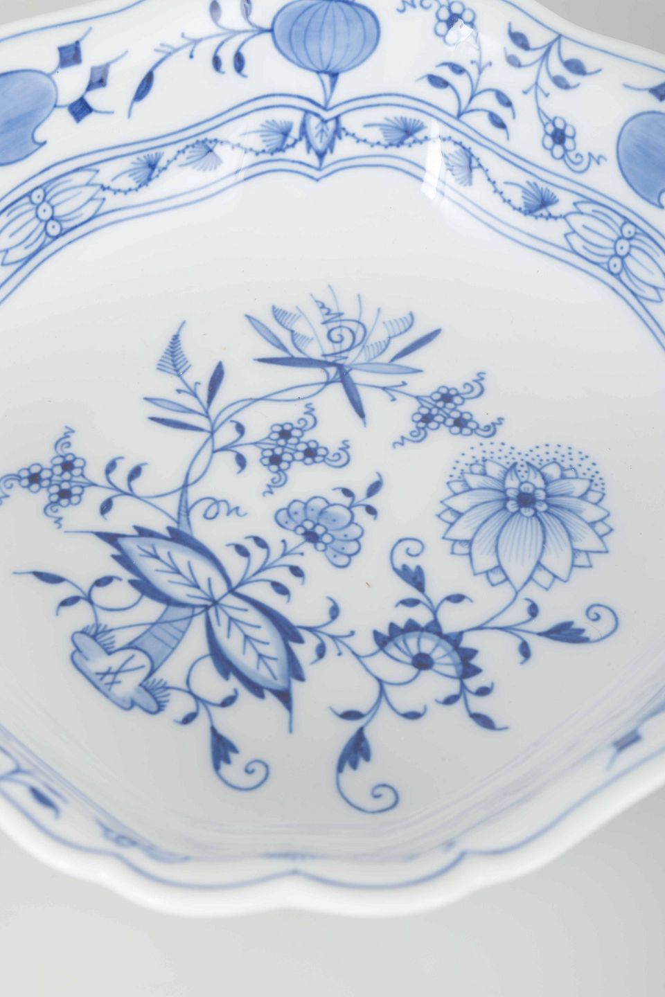 Elegant firkantet skål i hvidt porcelæn med blå underglasurdekoration i det klassiske “Løgmønstret” (Blue Onion) mønster. Let bølget kant med svungne linjer og fint håndmalet ornamentik.