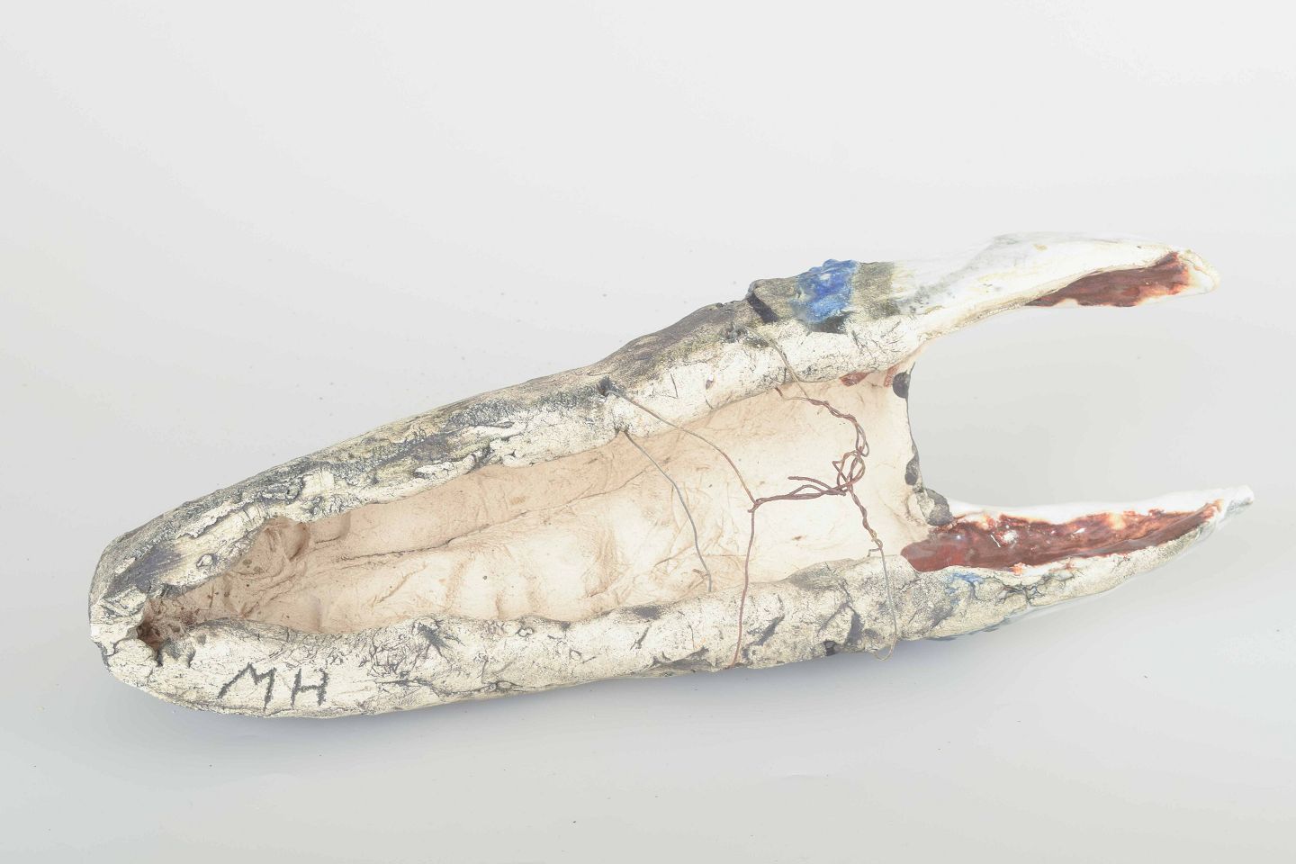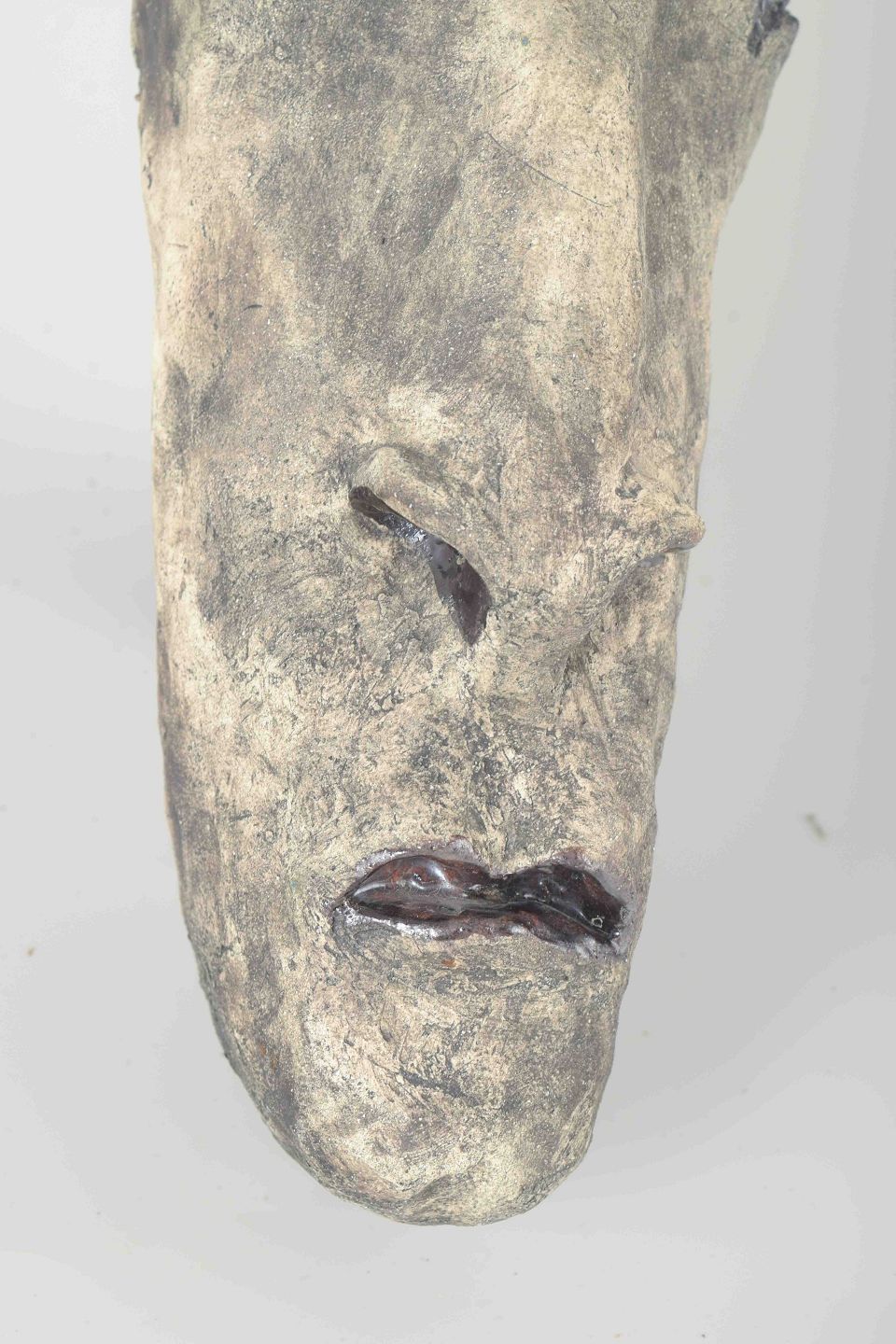 Unik, håndmodelleret skulptur i stentøj med rå overflade i gråtoner, dekoreret med blå glasurbånd og hvide hornlignende former. Et ekspressivt og figurativt værk med stærk personlig karakter.