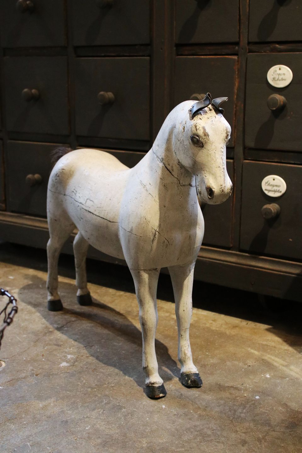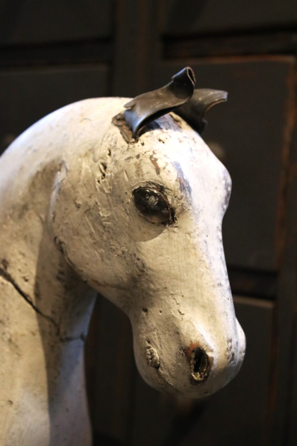 Svensk 1800 tals træ hest med fin patineret grå / hvid farve, læder øre , glas øjne og hale i ægte hestehår.
