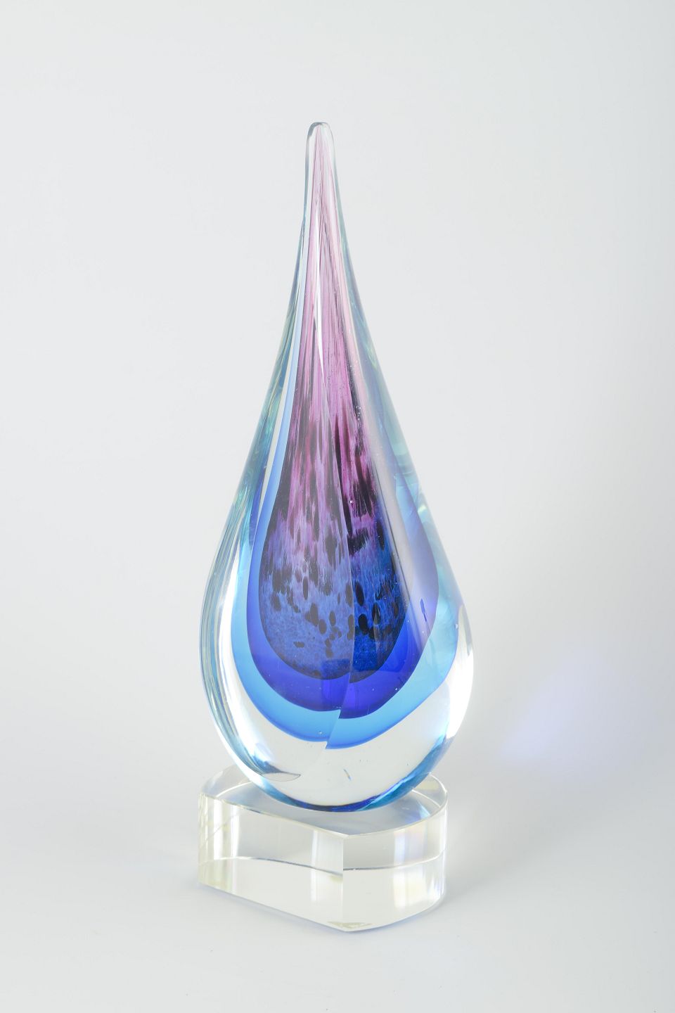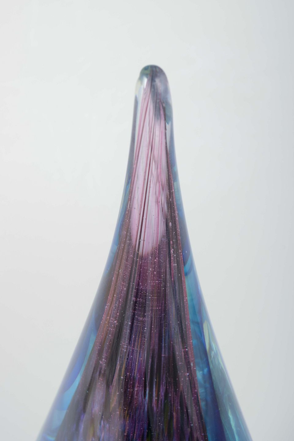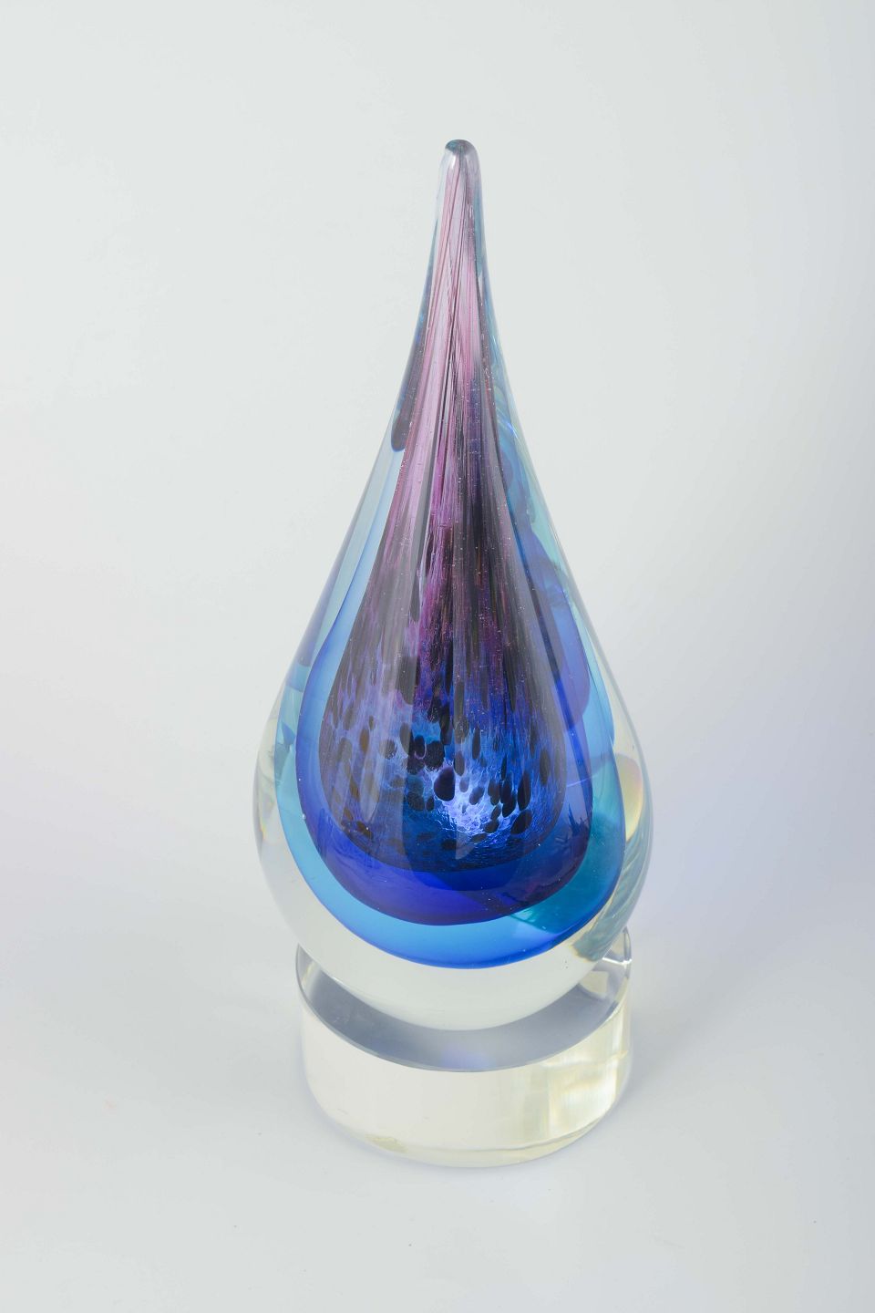 Håndlavet skulptur i klart glas med indvendige lag i blå og violette nuancer, formet som en dråbe med elegant spids top. Monteret på rund fod i klart glas.