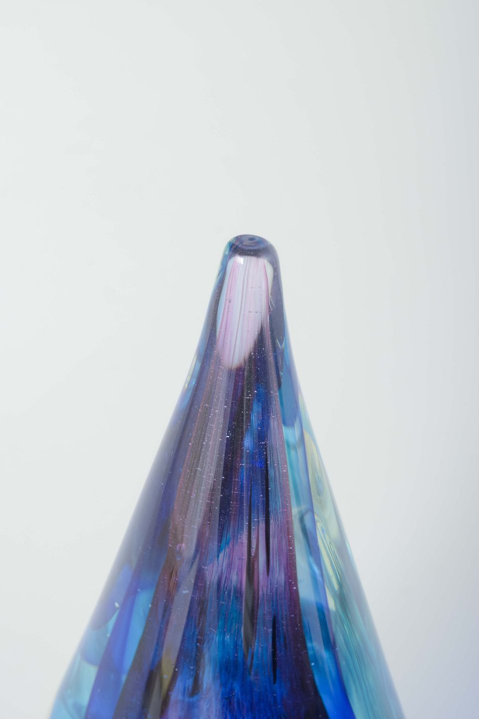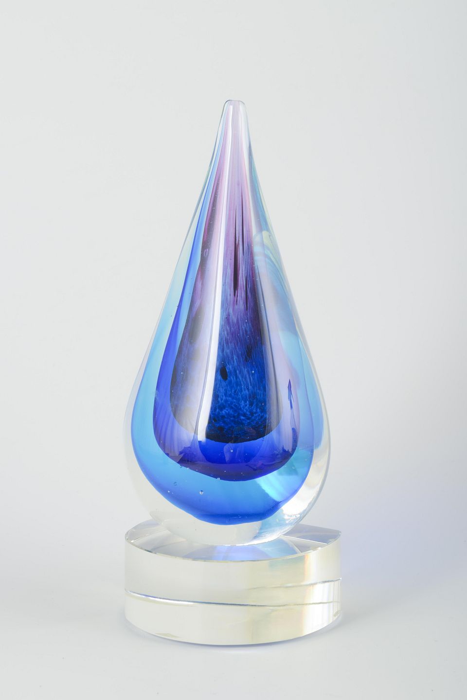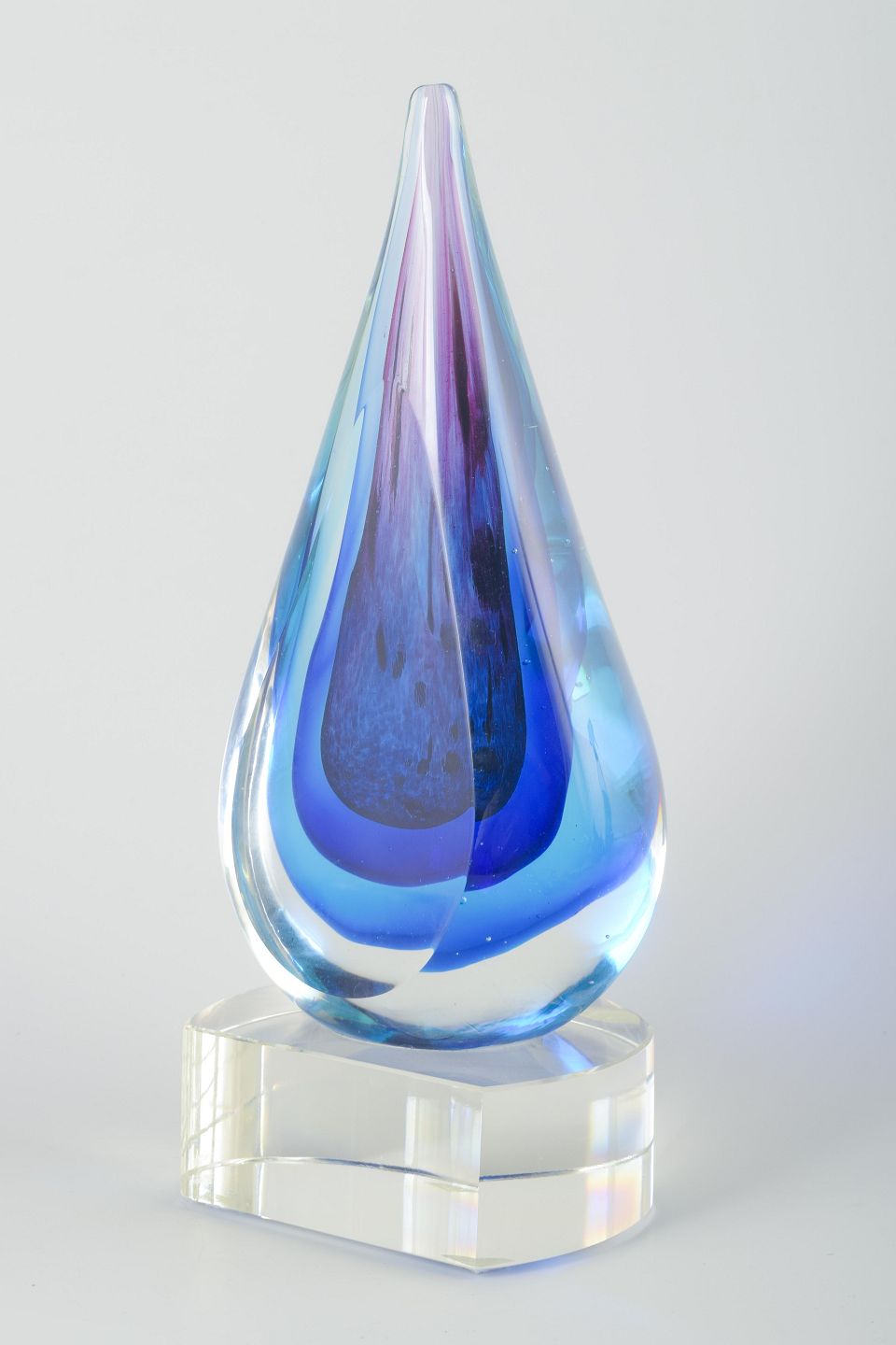 Håndlavet skulptur i klart og blåviolet glas, formet som en dråbe med optiske lag og elegant spids top. Monteret på rund fod i klart glas.