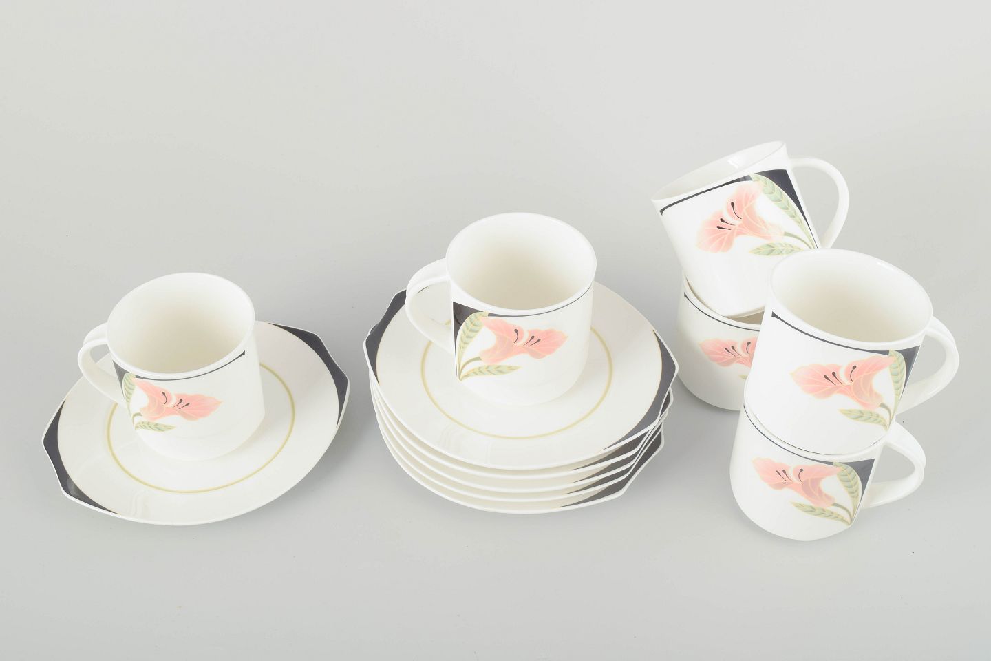 Seks porcelænskopper med tilhørende underkopper, dekoreret med håndmalede blomster i rosa, grønne og sorte nuancer. Serien kombinerer rene linjer og bløde former med et elegant postmodernistisk udtryk.