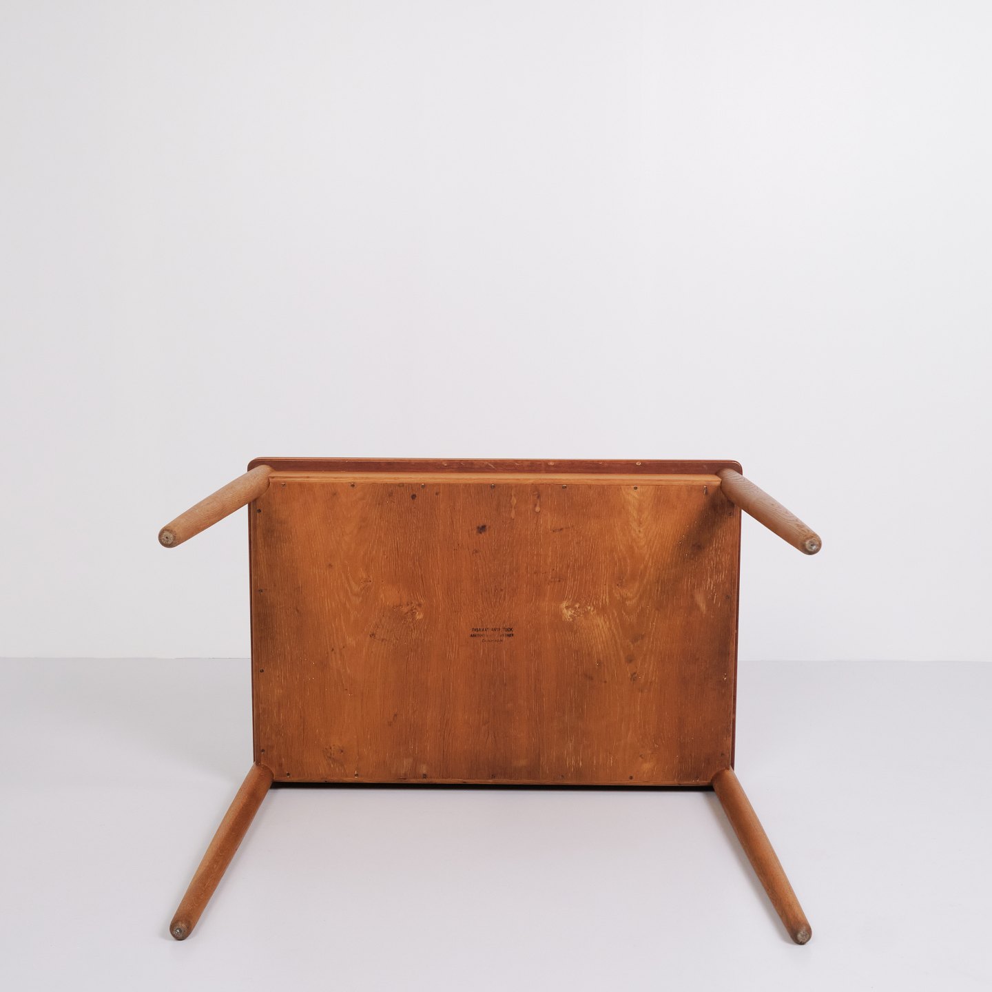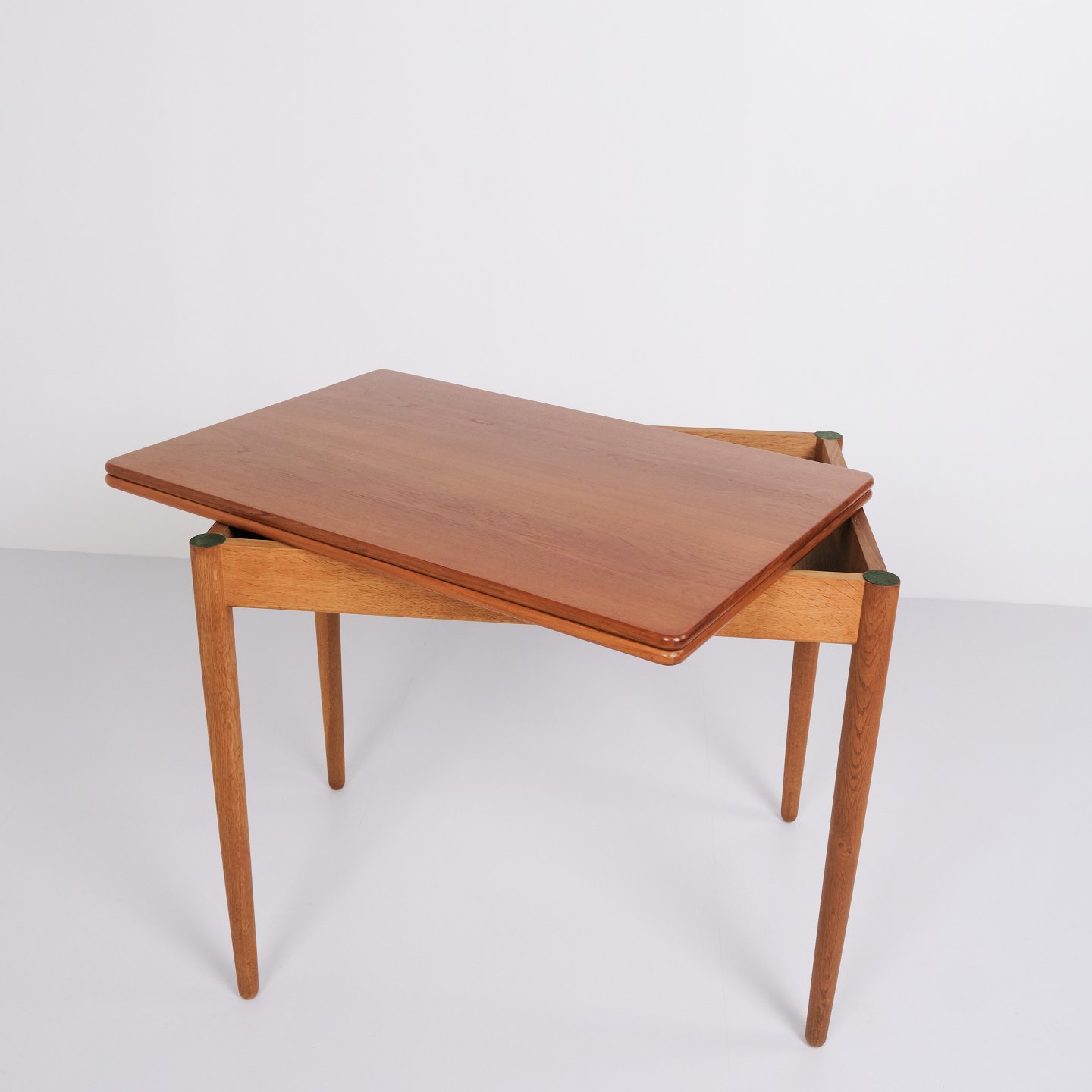 Hans J. Wegner spise/spillebord for Andreas Tuck. Teak og eg, 1960’erne. Indbygget opbevaring.