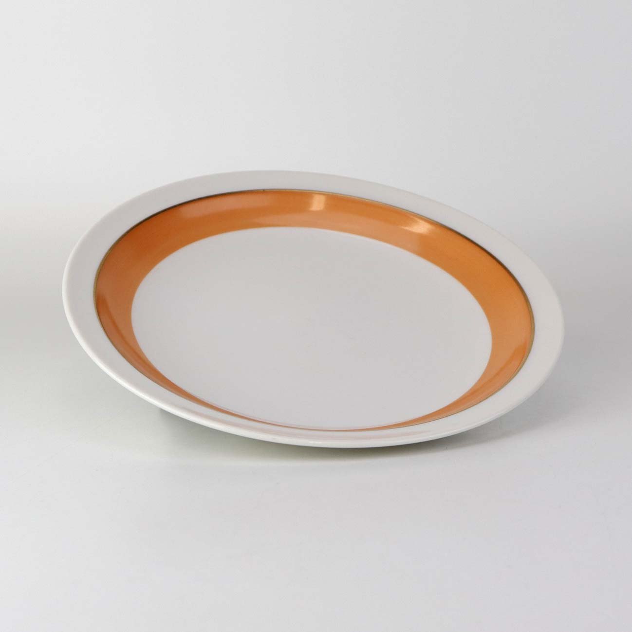 Service i glat hvidt porcelæn med orangerød dekoration over glasuren og guldkant