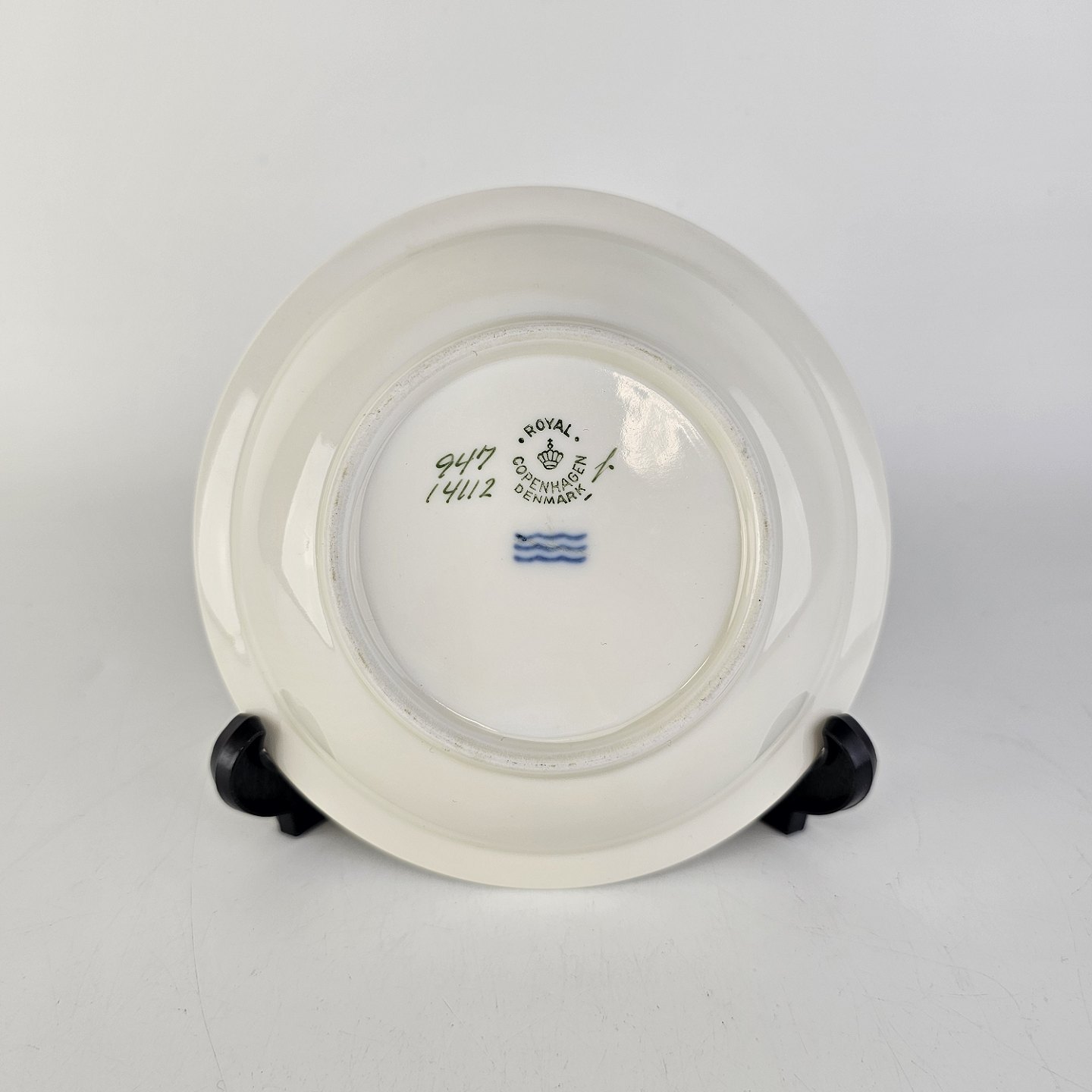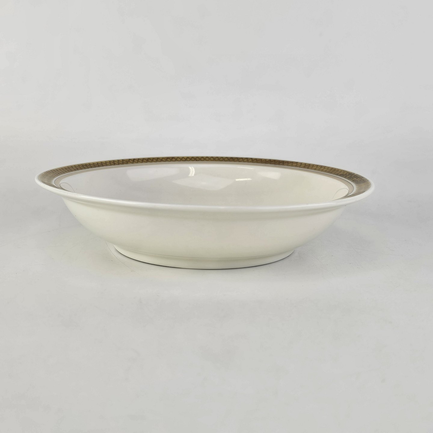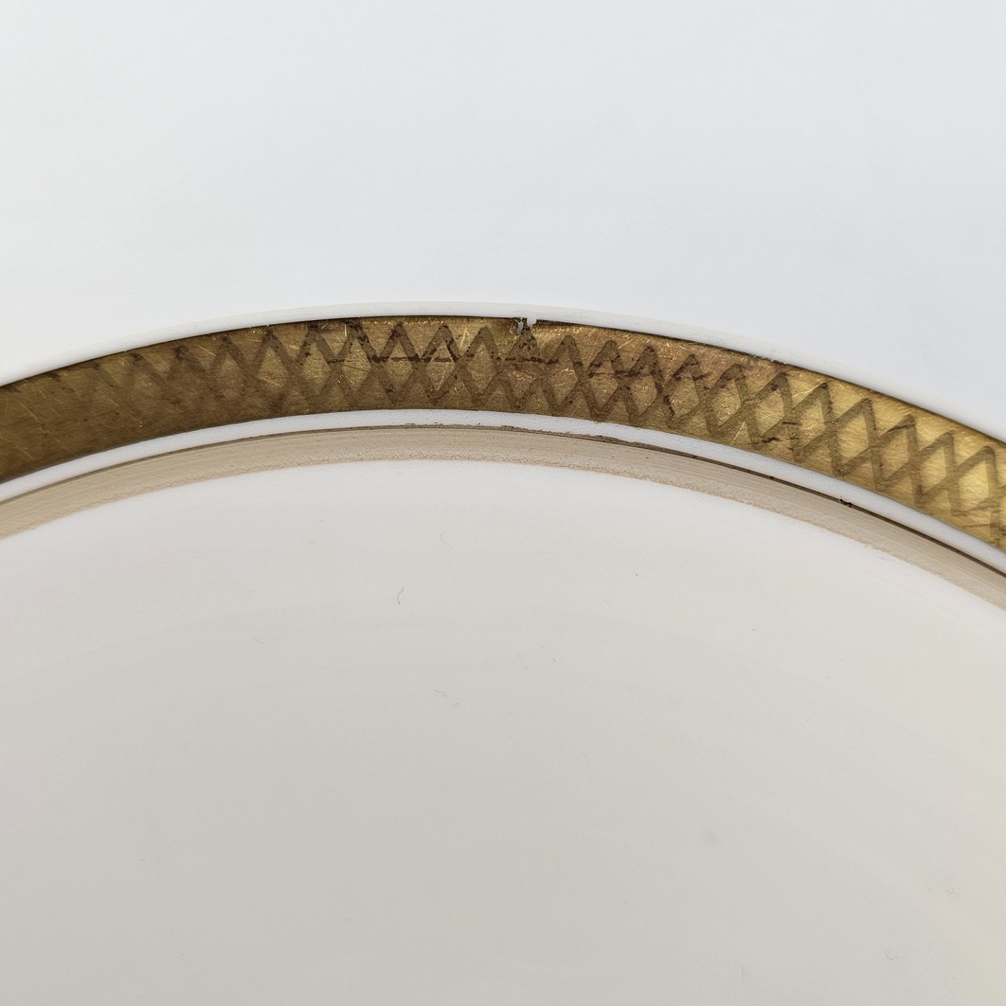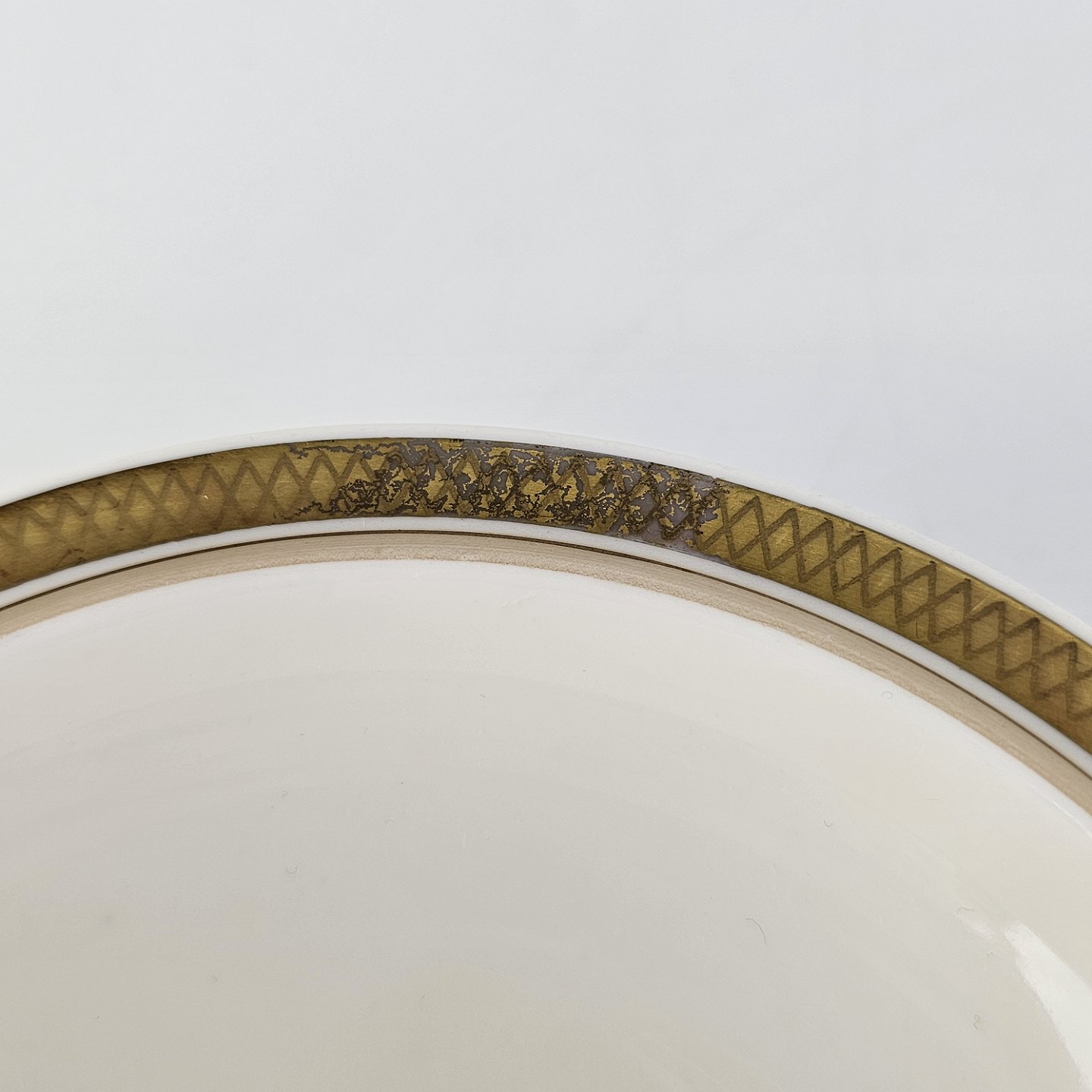 Cremefarvet porcelæn med motiv af gylden kløverblomst og bred graveret guldkant.