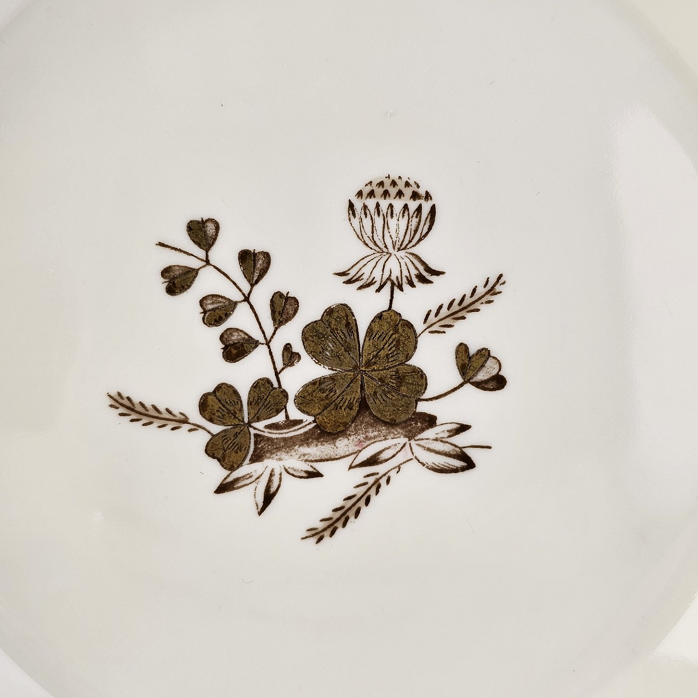Cremefarvet porcelæn med motiv af gylden kløverblomst og bred graveret guldkant.