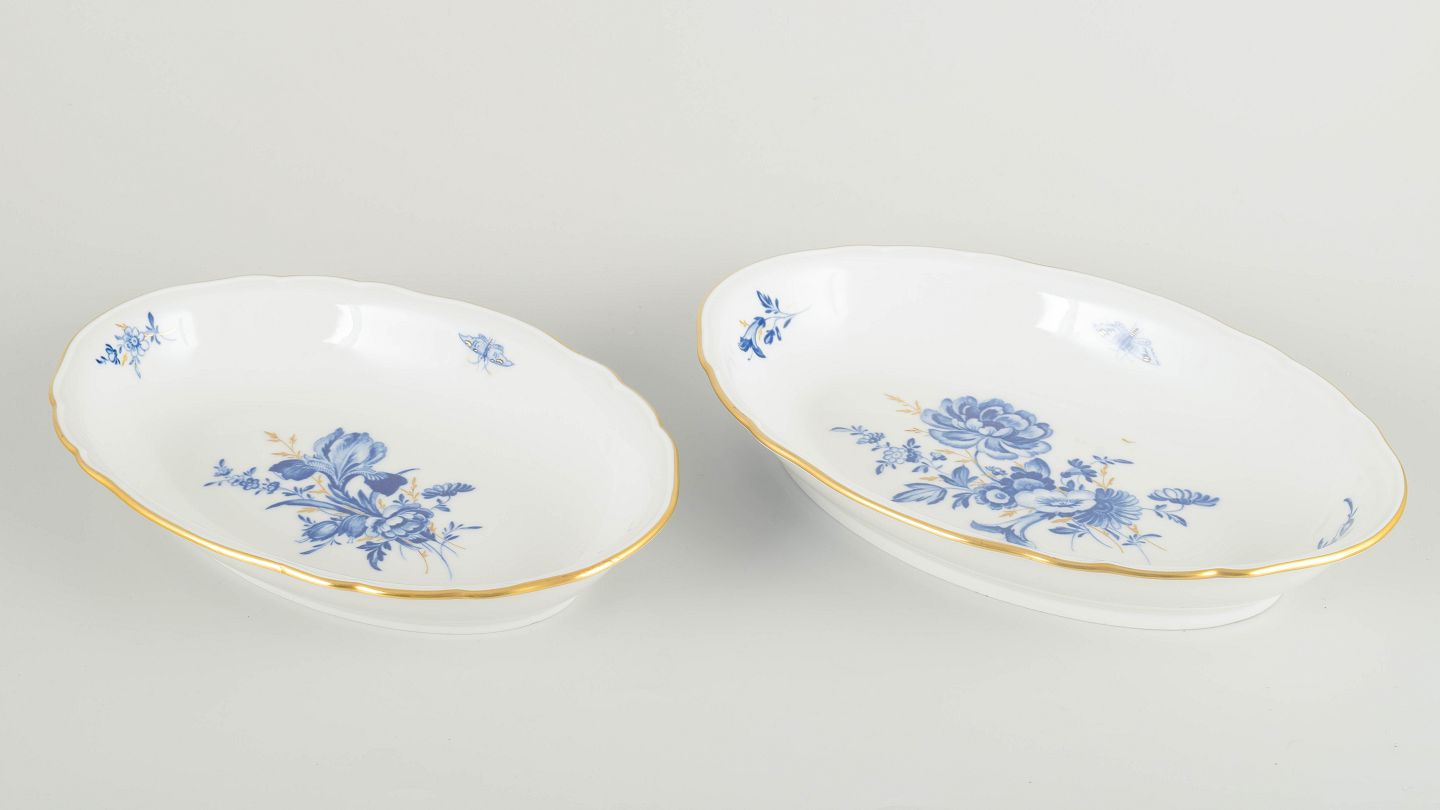 Hånddekoreret porcelæn med håndmalede blå blomsterdekorationer og forgyldt staffering langs kanten. Klassisk elegant Meissen-form med let bølget rand.