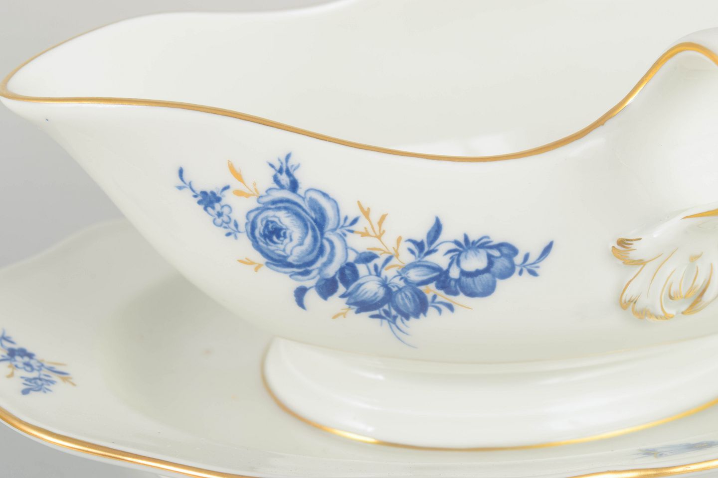 Hånddekoreret porcelæn med håndmalede blå blomsterdekorationer og forgyldte stafferinger langs kanter og hank. Elegant asymmetrisk form med dobbelt hank.