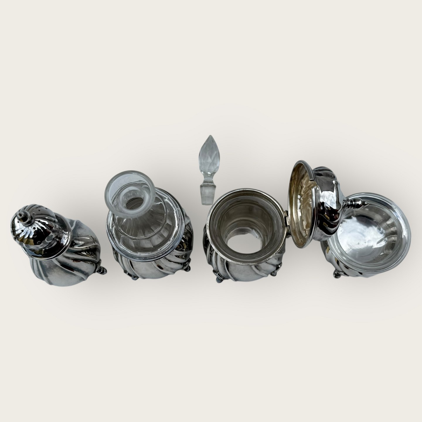 Cohr silverware factory, Plat de Menage, 4 parts, salt shaker with glass insert, mustard jar also with fine glass insert and bottle / carafe in fine condition (height 15.5cm), Salt shaker diameter 6cm, mustard jar 11cm high, Pepper shaker 12cm high