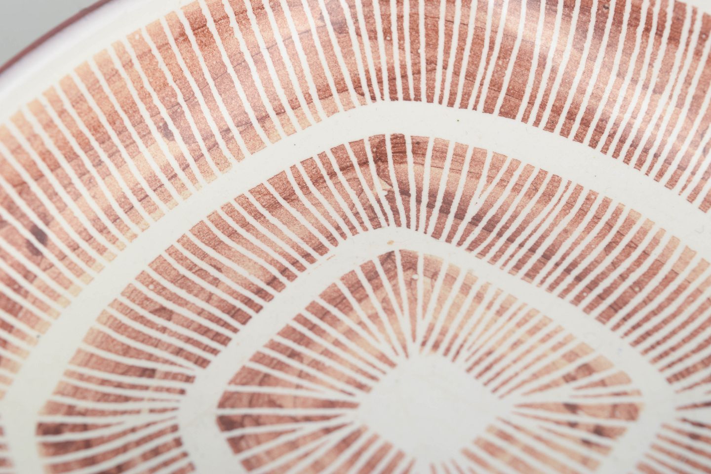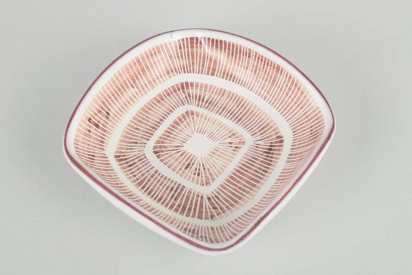 Lille organisk formet skål/fad i glaseret stentøj med karakteristisk grafisk radialdekoration i rødlige og hvide toner.