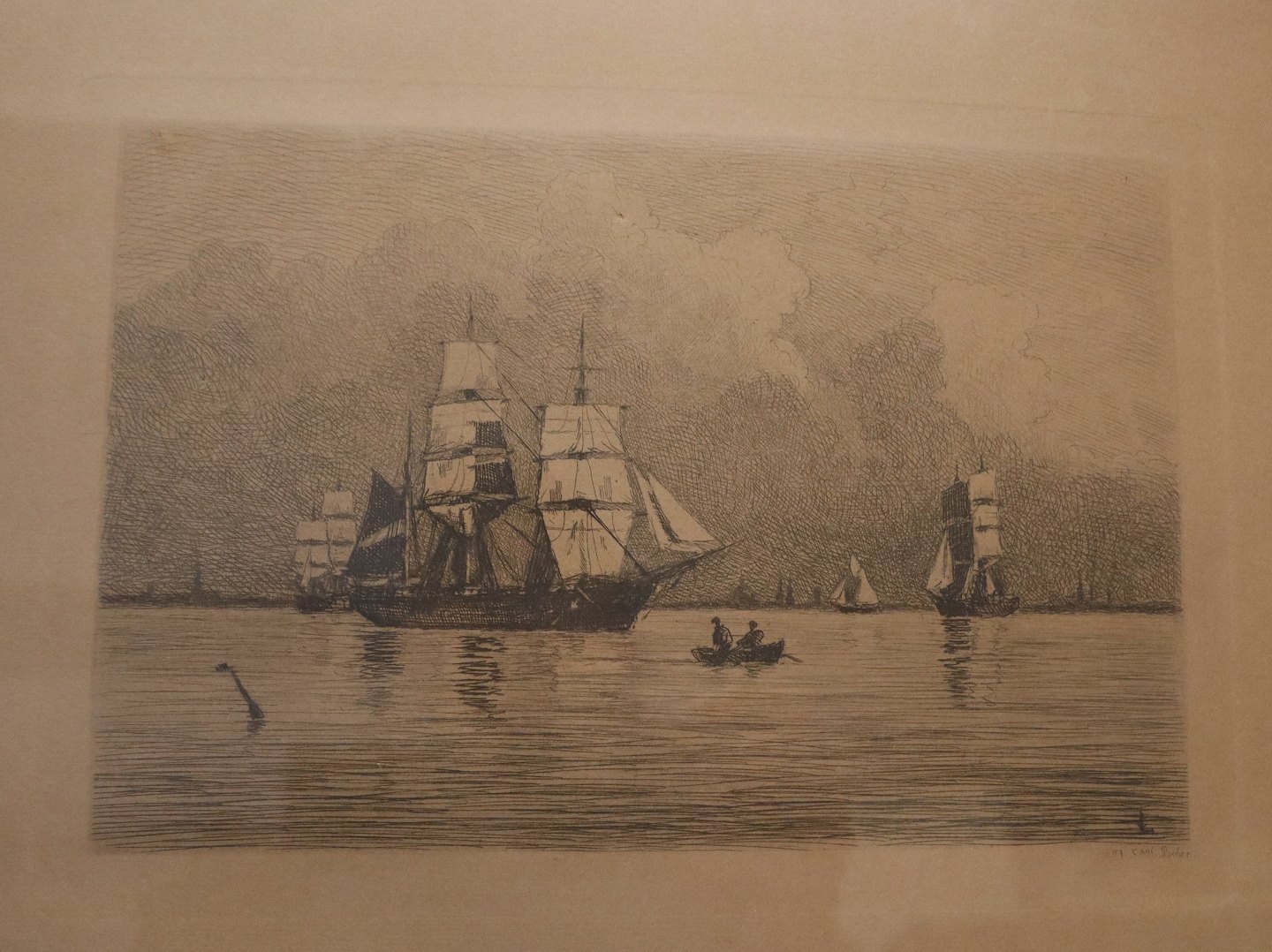 Radering: Carl Locher 1907 Marine motiv med sejlskibe 45 x 41 cm inklusiv originalt glas og guldramme