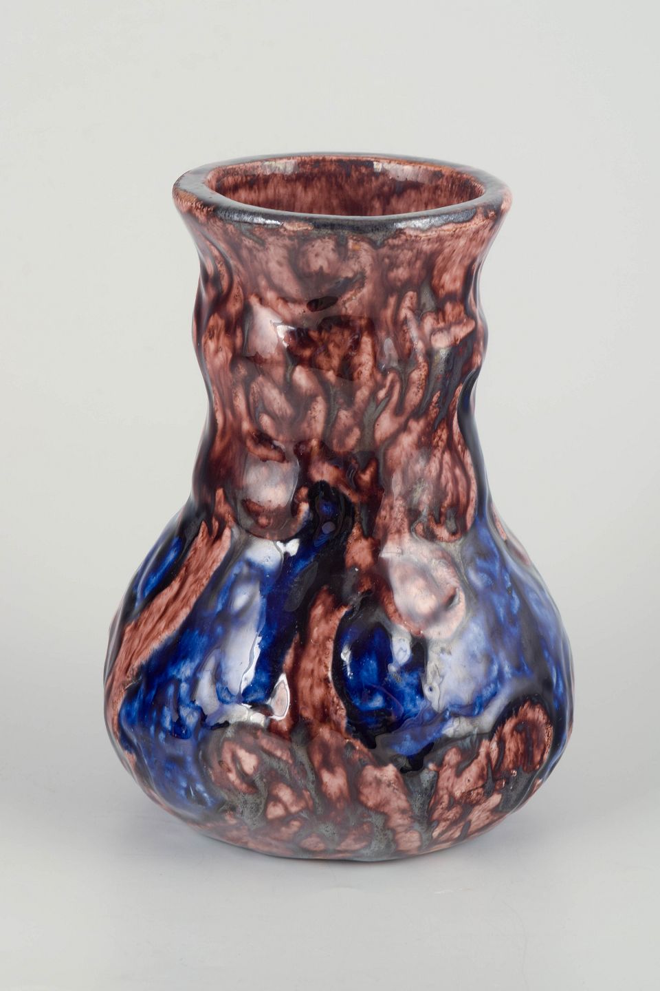Håndformet stentøjsvase med blød buet krop og levende flammet glasur i dyb brun med flydende blå top og lodrette penselstrøg i jugendpræget udtryk. Unikt håndlavet værk.