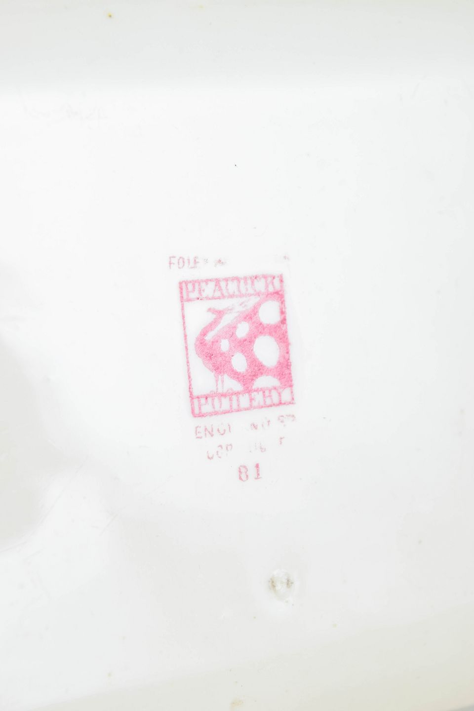 Hvidt porcelæn dekoreret med polykrome blomster og karakteristisk bølgende bånd i art-deco / chinoiserie-stil — ofte refereret til som “Peacock”-mønster.