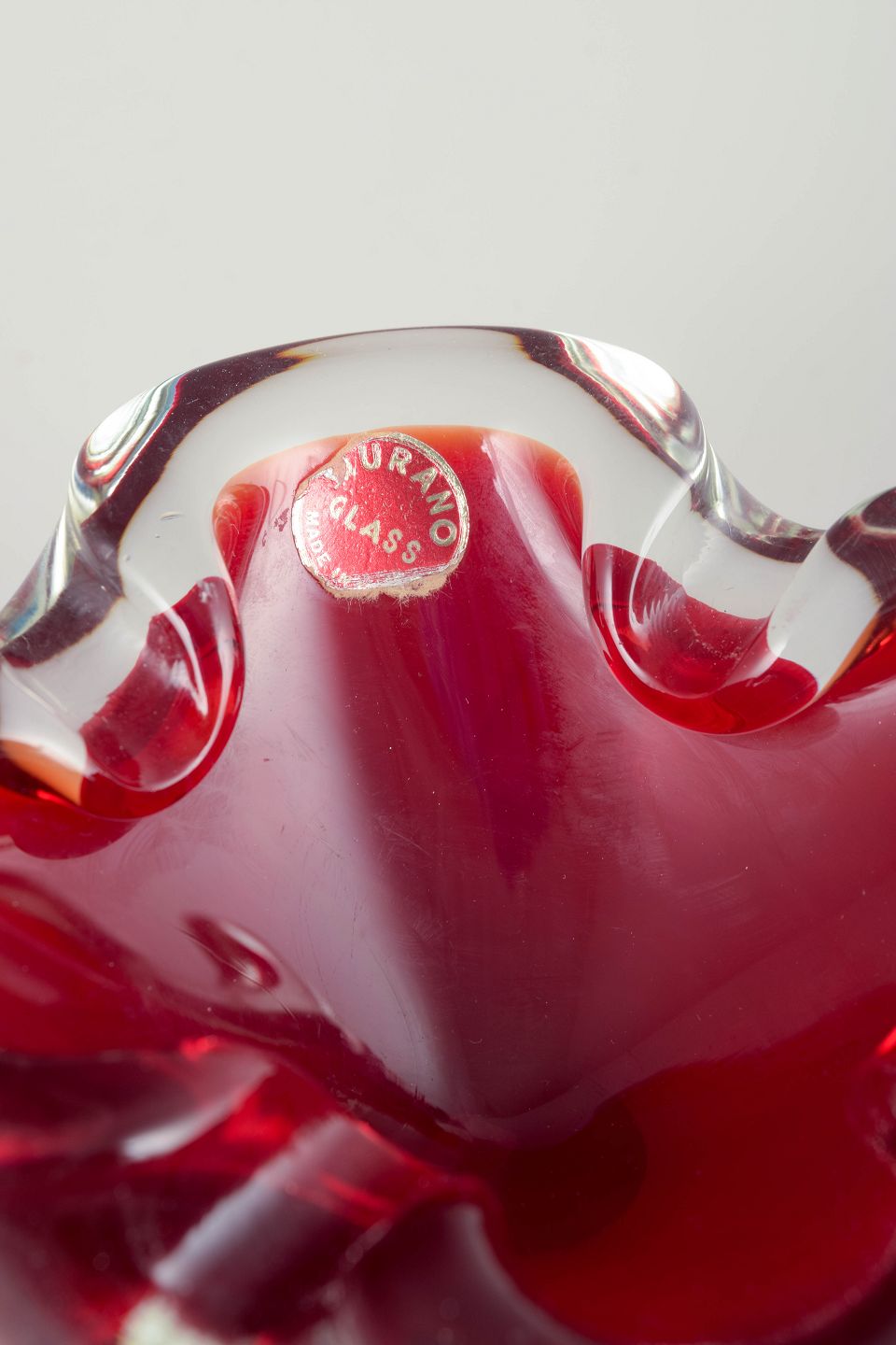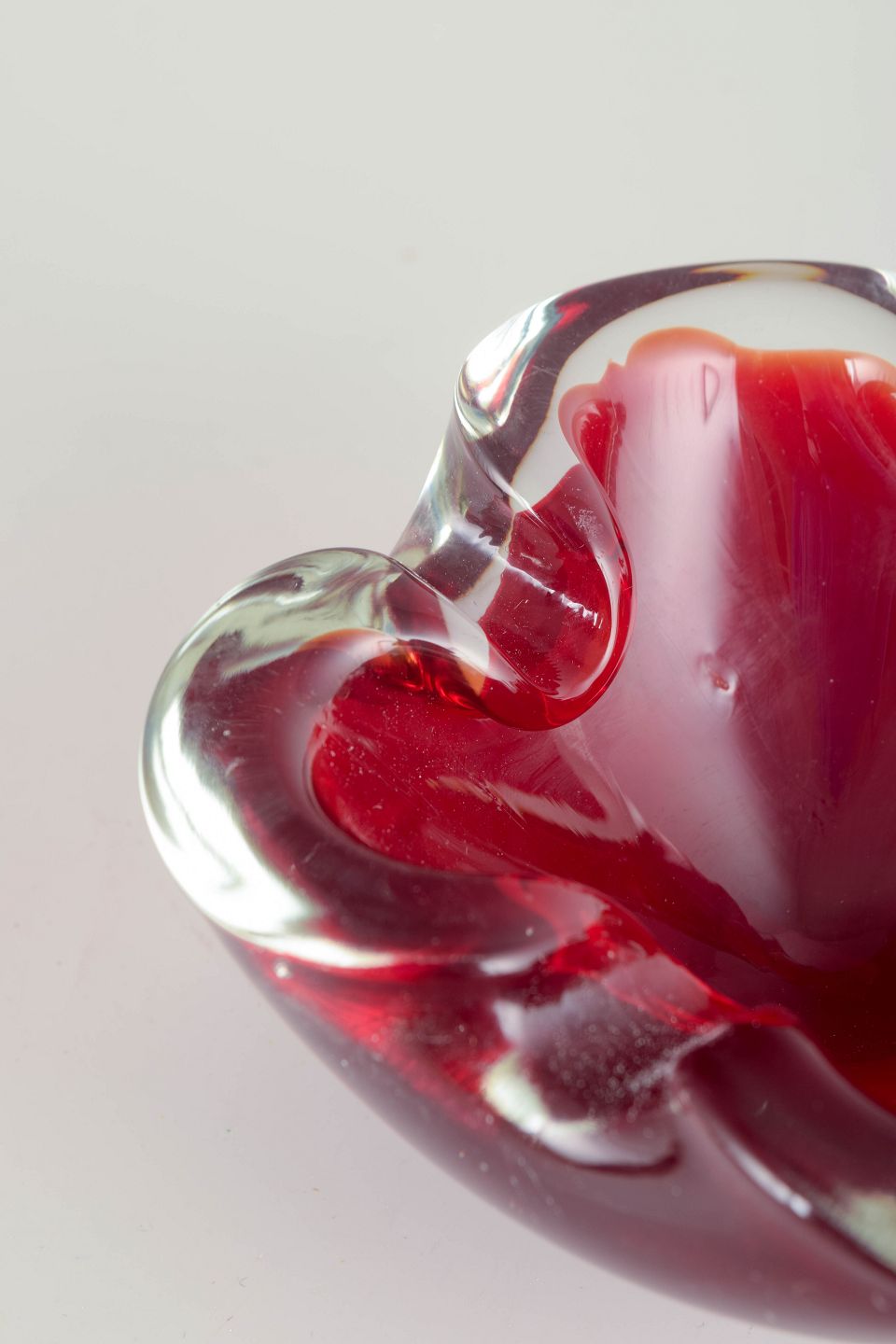 Organisk fritformet håndblæst skål i intens rubinrød sommerso-glas med blødt indfoldet rand og svævende klarhedsdybde — et klassisk eksempel på studioglas fra Murano.
