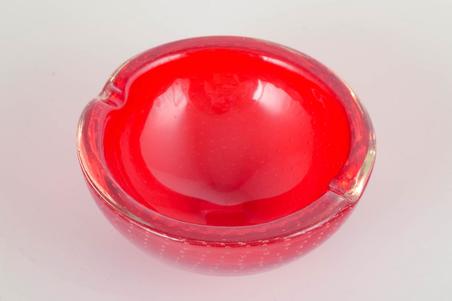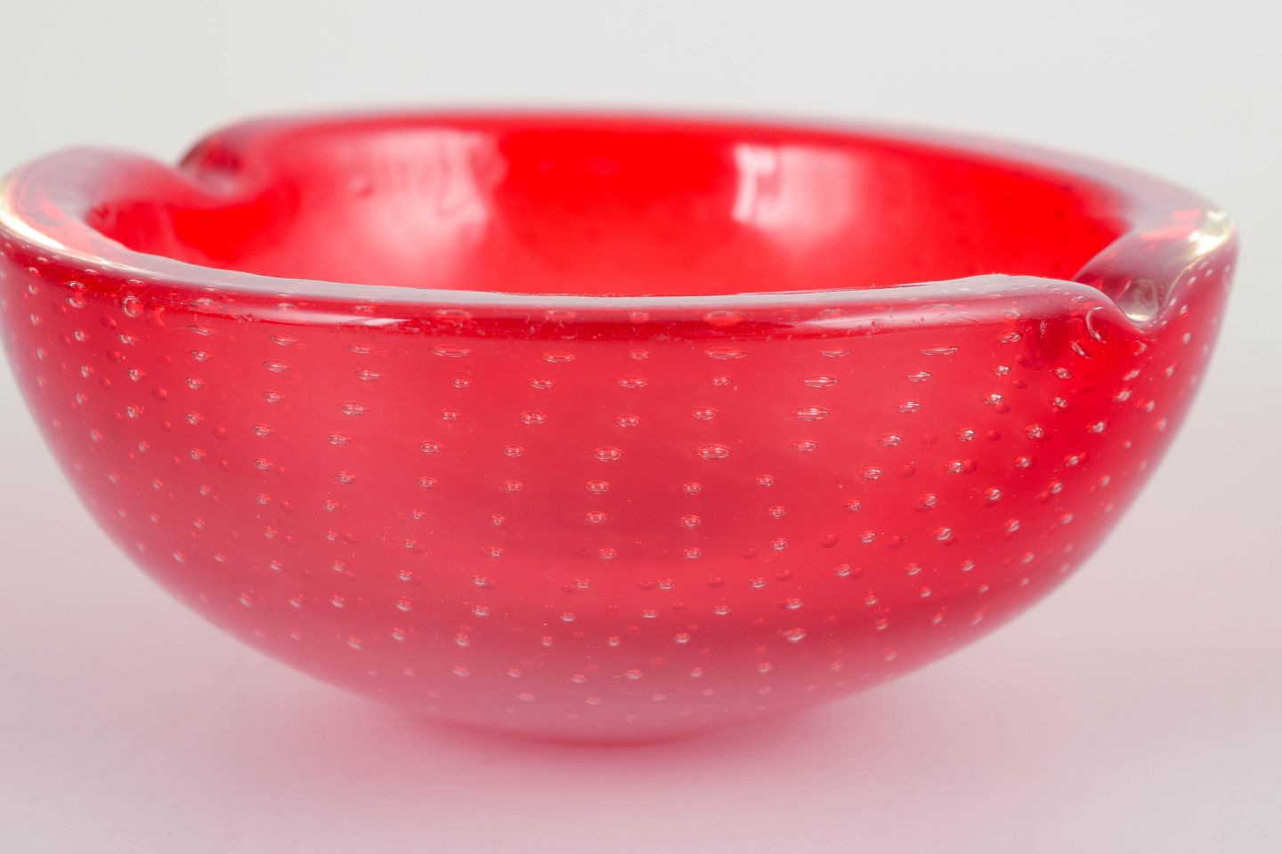 Organisk formet mundblæst skål i rød sommerso-teknik med fanget luftboblemønster (bullicante), typisk for italiensk Murano-glasproduktion.