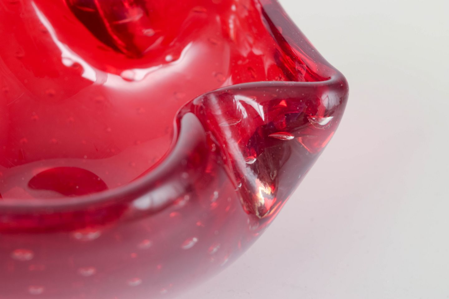 Organisk formet mundblæst skål i rød sommerso-teknik med fanget luftboblemønster (bullicante), typisk for italiensk Murano-glasproduktion.