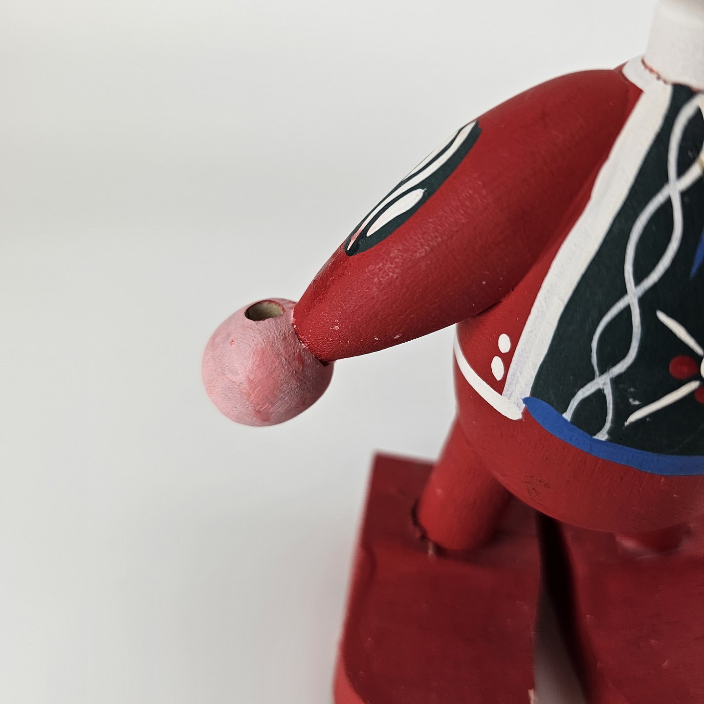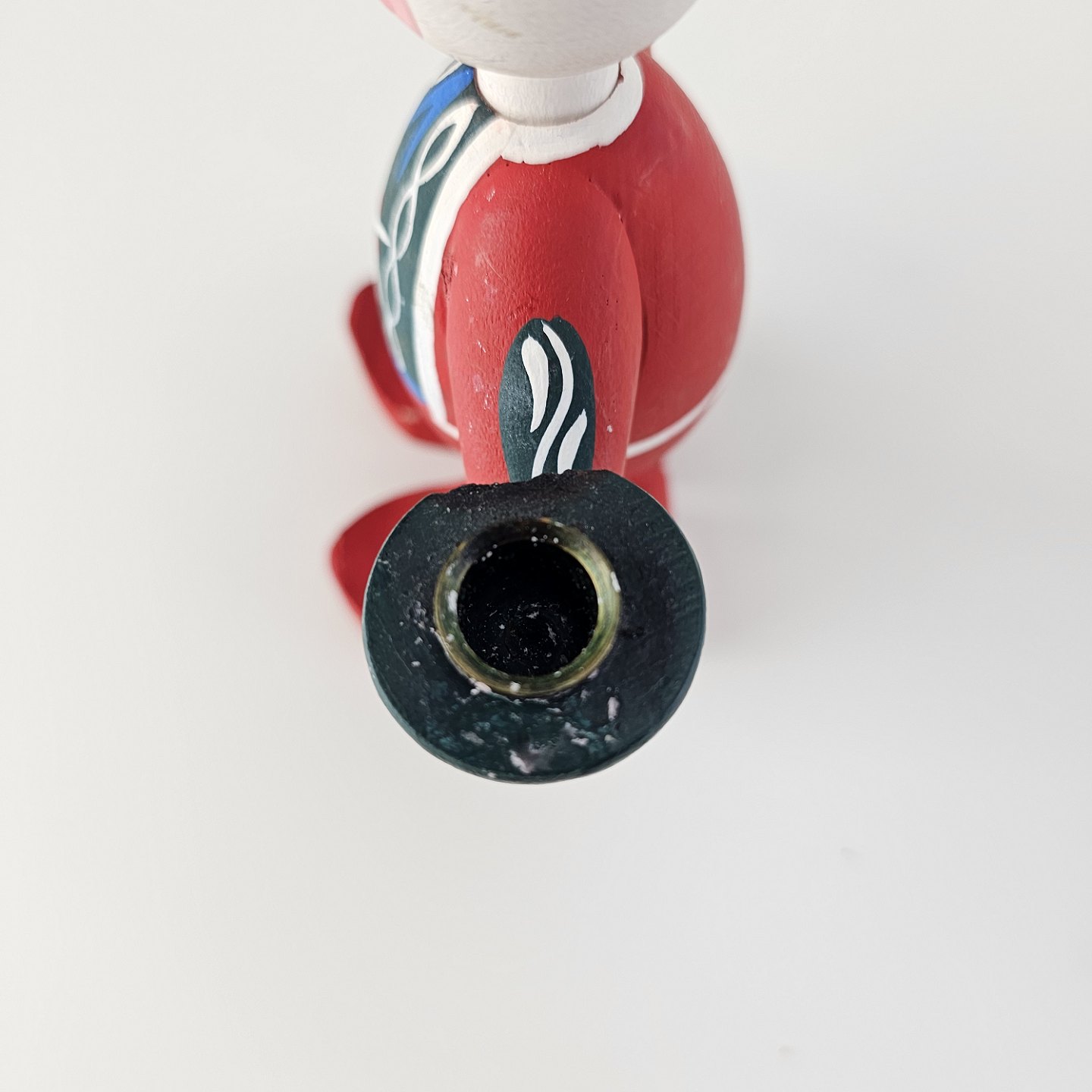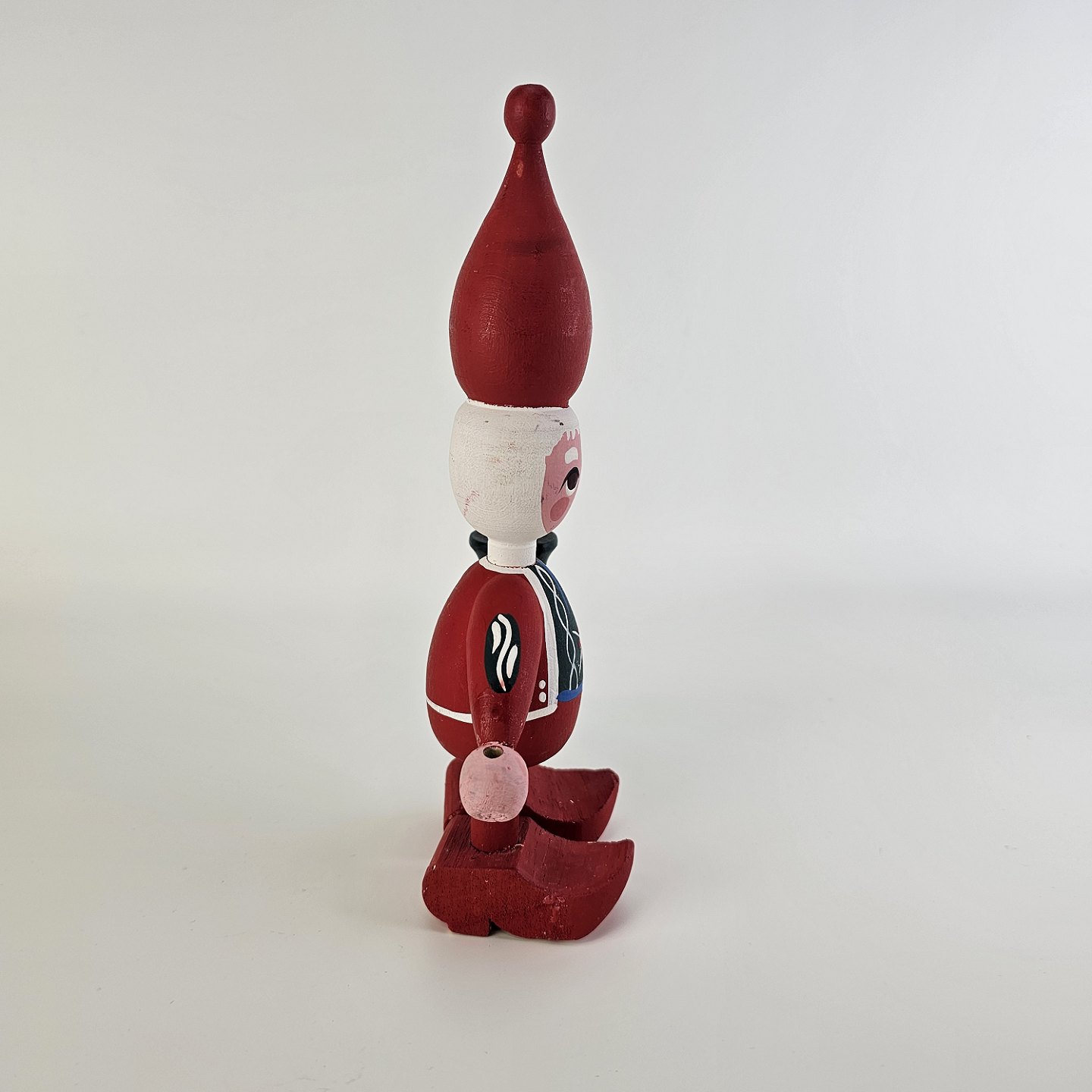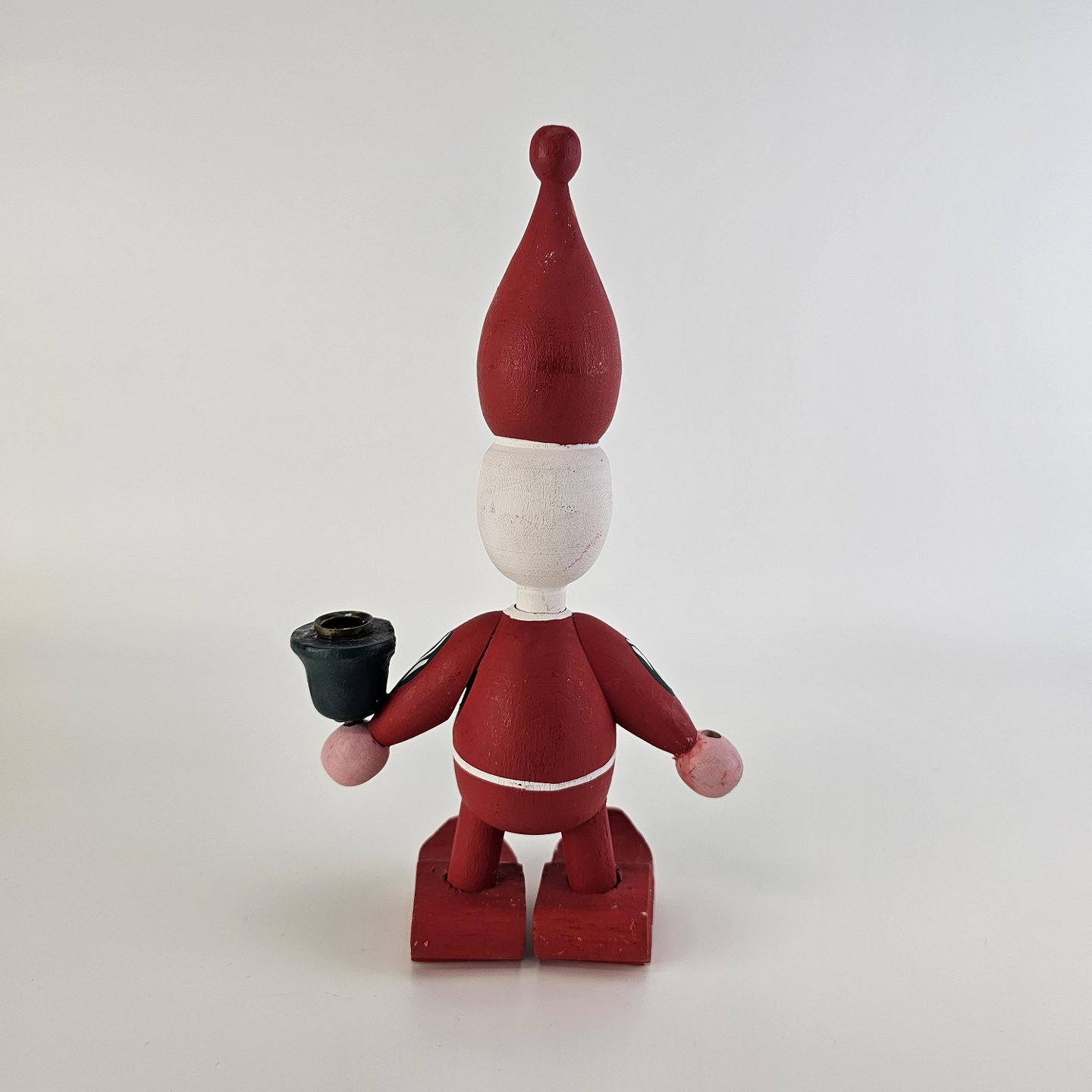 En håndmalet figur i træ med motiv af en nisse med en kerteholder