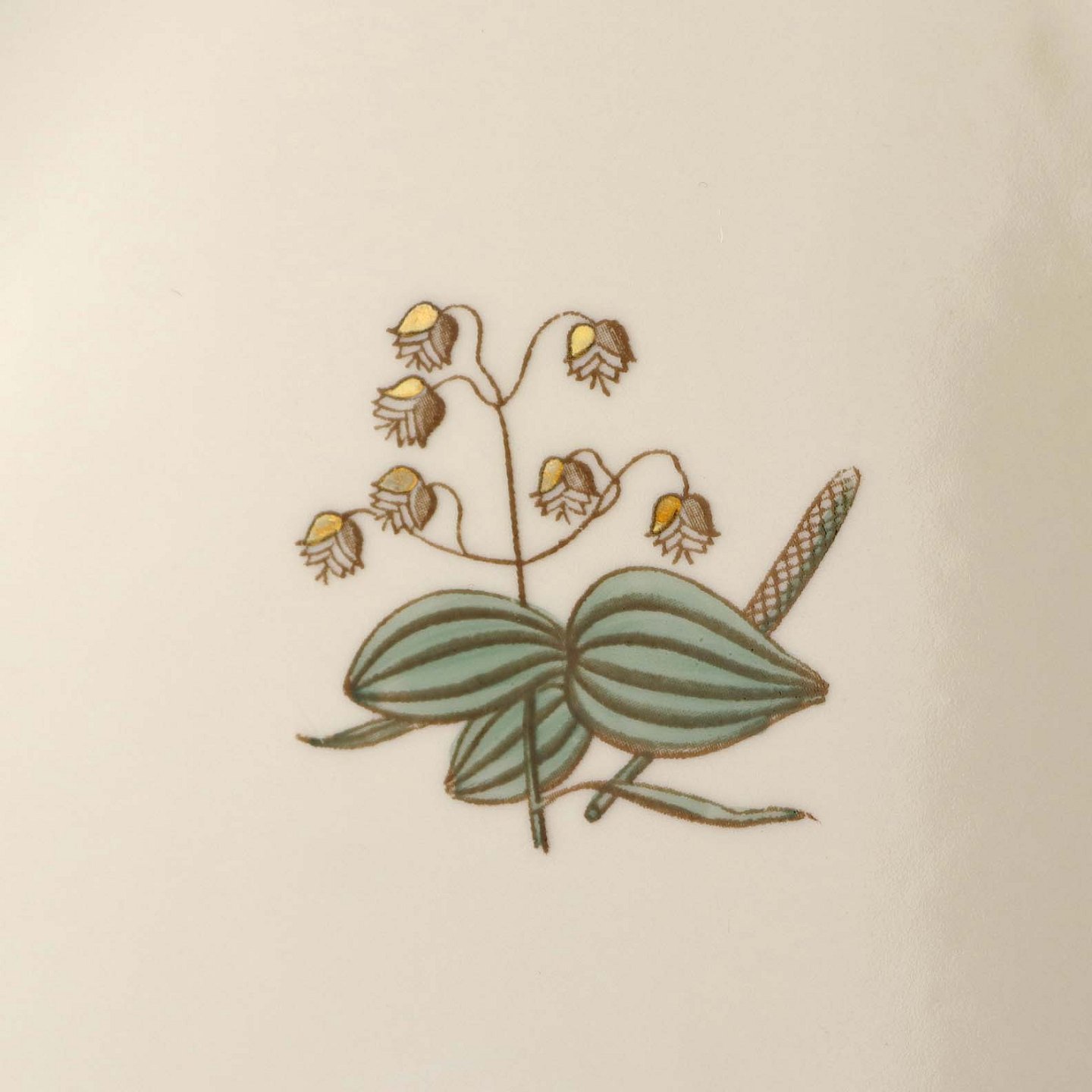 Stel i glat råhvidt porcelæn dekoreret med lysegrøn stribe og guldkant samt motiv af hjertegræs.