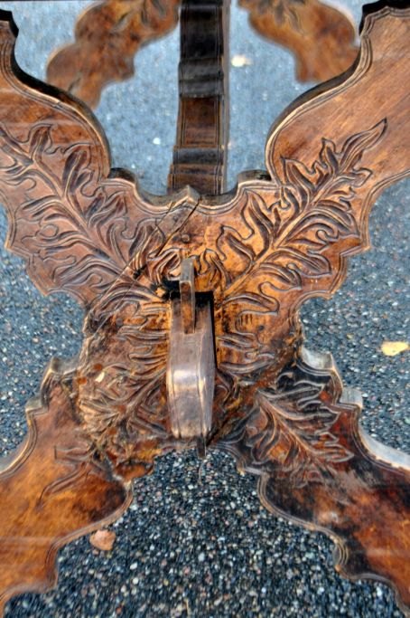 Antikt langbord med skæringer og skuffe, 19. årh. Utallige skæringer på plade, skuffe, ben og understel. I midten udskæring af hertug krone. Antagelig Tyskland. L.: 141 cm. B.: 73 cm. D.: 77 cm.