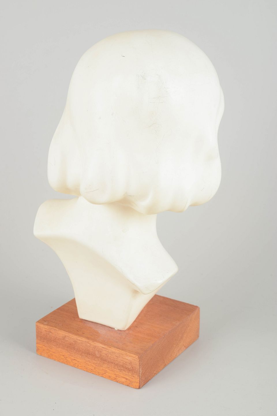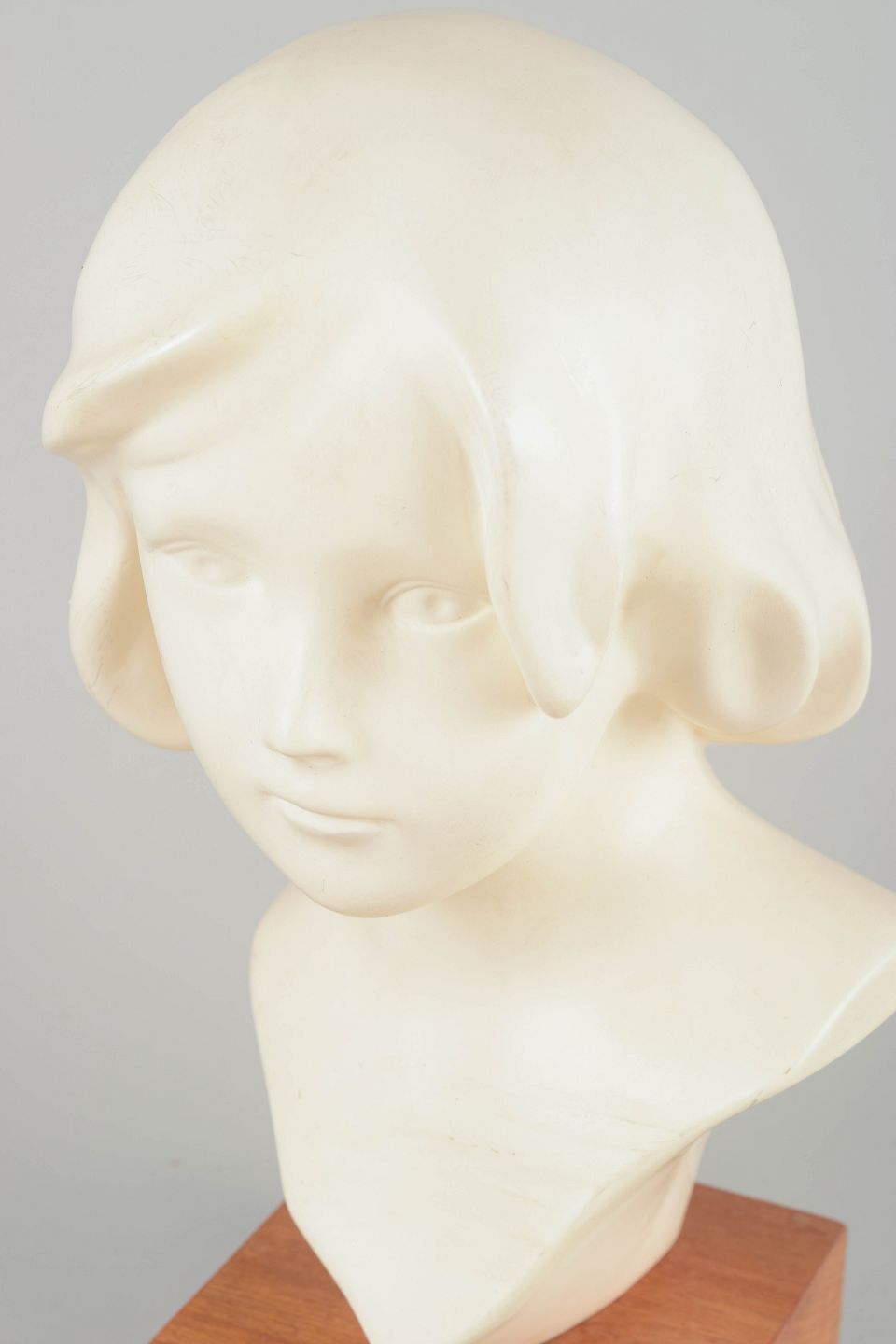 Hvidpatineret gipsbuste af ung pige på massiv træfod med metalskilt “PÅSKLILJAN”. Klassisk naturalistisk formsprog med blød, mat overflade.