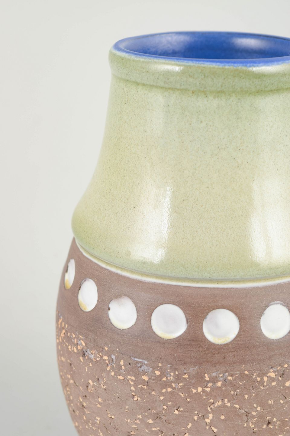 Dekorativ stentøjsvase i organisk form med mat, brun strukturoverflade på den nederste del, bånd med hvide cirkulære felter samt blankt glasurforløb i lysegrønne nuancer. Indvendigt udsmykket med dyb koboltblå glasur, som skaber en elegant kontrast.