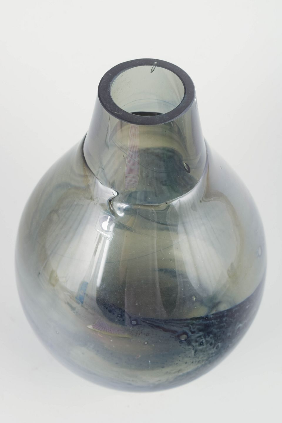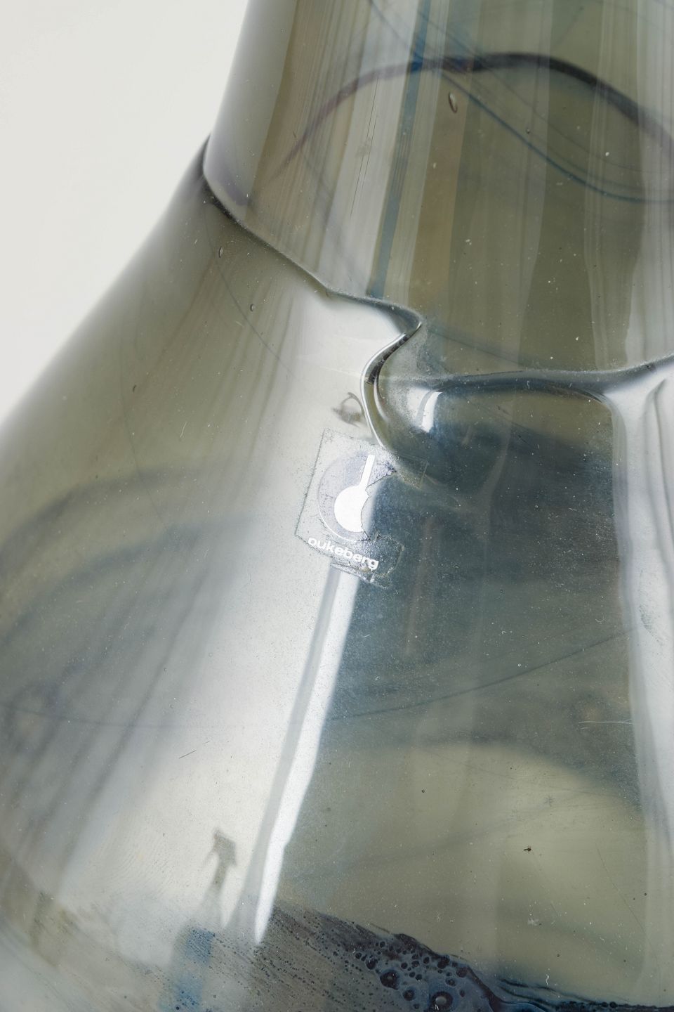 Skulpturel pæreformet vase i mundblæst glas med atmosfærisk, hav-/landskabslignende indre farvespil i blå-grå toner, typisk for Pukebergs eksperimenterende studioglas fra perioden.