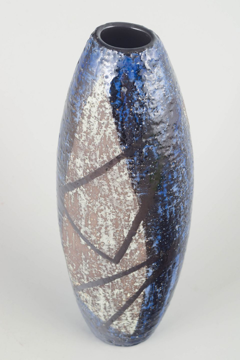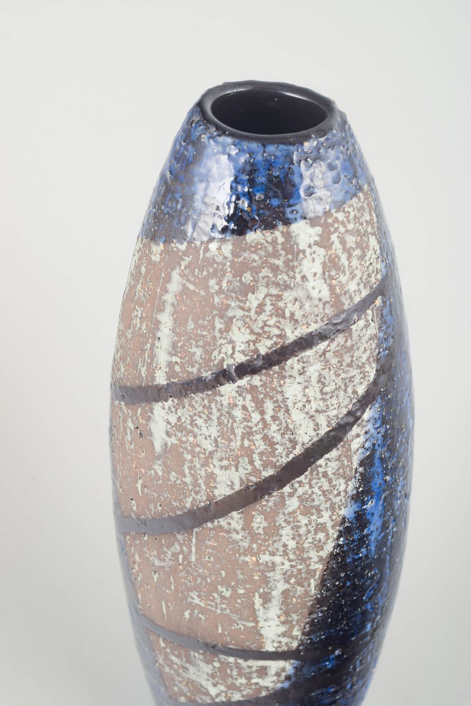 Elegant højtformet vase i chamotteret stentøj med karakteristisk reliefglasur i blå, sølv- og brunlige nuancer, dekoreret med abstrakte organiske linjer – et typisk eksempel på Atterbergs modernistiske formsprog for Upsala Ekeby.