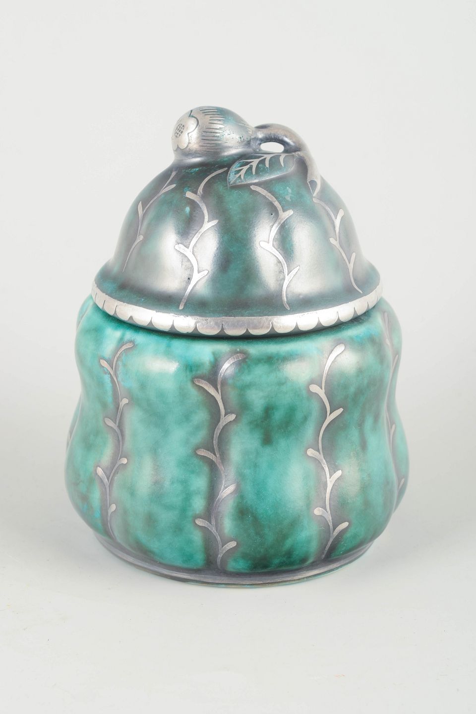 Art Deco lågkrukke i stentøj med turkis glasur og indlagt sølvdekoration, organisk svunget korpus og karakteristisk forhøjet låg med botanisk reliefmotiv og figurativ knop. (Model 851)