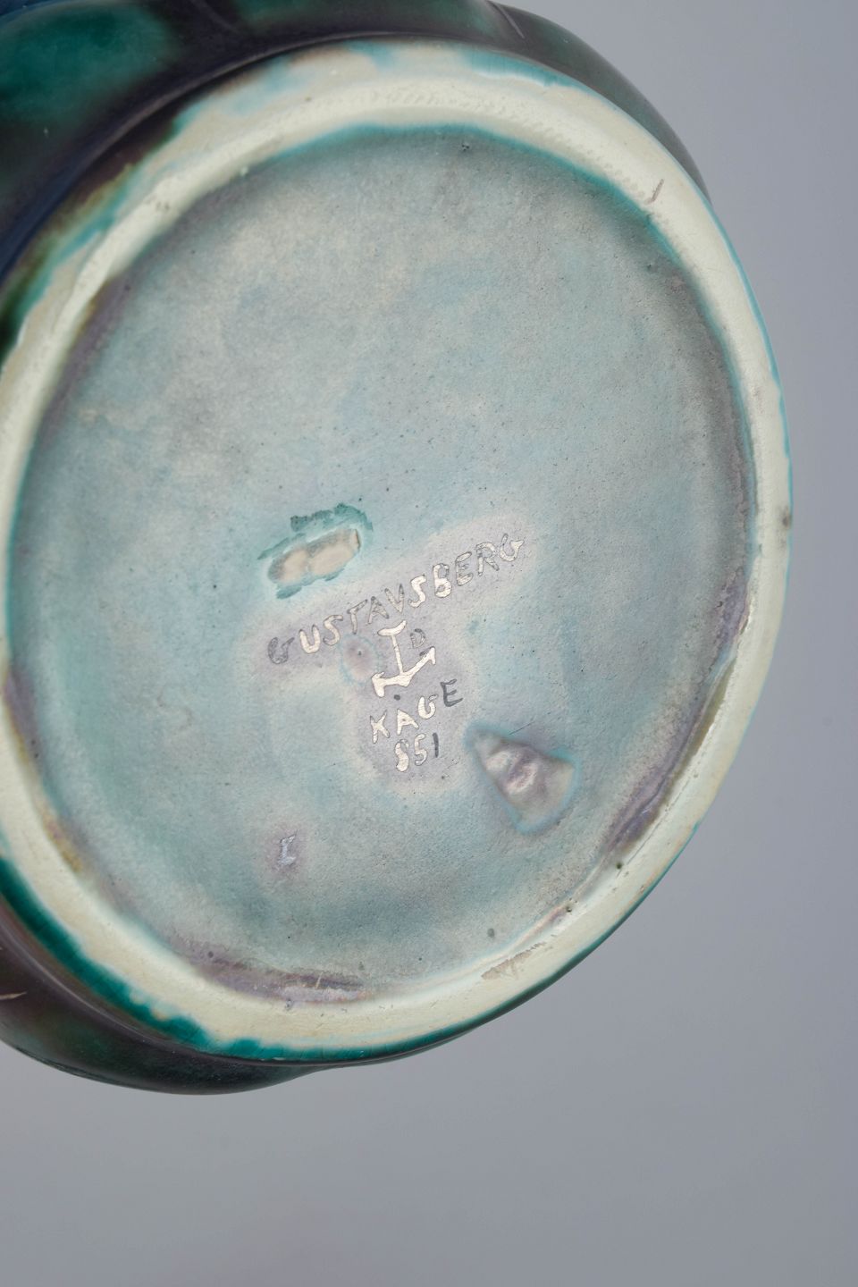 Wilhelm Kåge (1889–1960) var chefdesigner hos Gustavsberg fra 1917 og en hovedfigur i svensk Art Deco. Argenta-serien, lanceret i 1930’erne, kombinerer kølige turkise glasurer med indlagte sølvmotiver og regnes som et ikon inden for nordisk keramisk design.