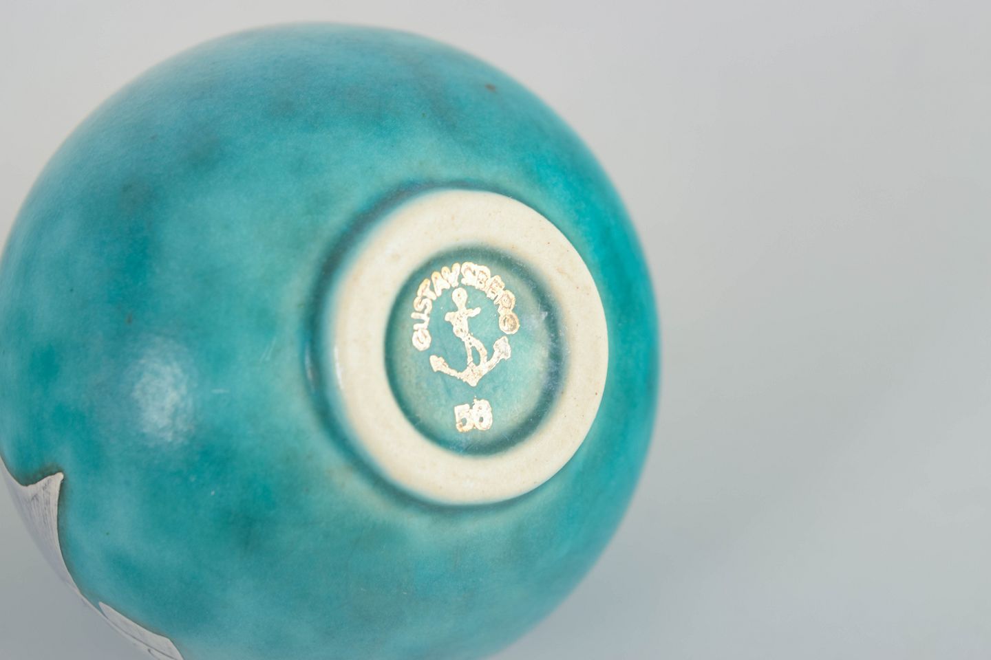 Lille rund Art Deco-vase i stentøj med karakteristisk turkis glasur og indlagt sølvfiskemotiv — et ikonisk kendetegn for Kåges Argenta-arbejder.