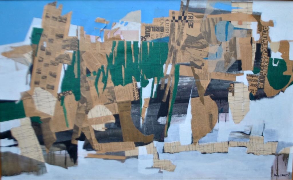 Ernst, Helge (1916 - 1991) Danmark: Nutidslandskab. Olie/collage på lærred. Signeret. 89 x 140 cm.
