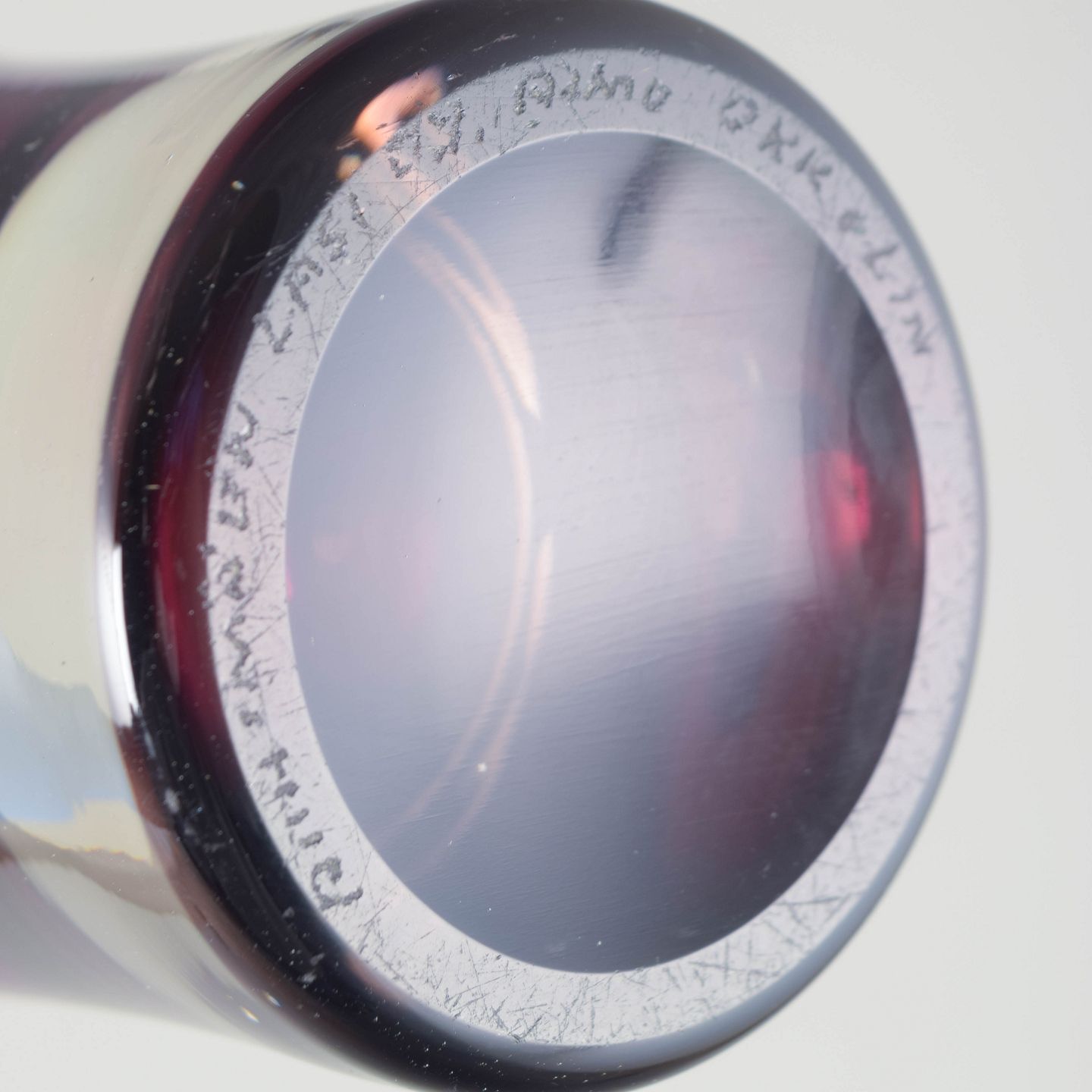 Elegant finsk kunstglasvase i klart og blåt glas med blødt afrundet form og karakteristisk nordisk enkelhed. Et klassisk eksempel på Okkolins design for Riihimäen Lasi i 1960’erne, kendt for sine rene linjer og poetiske lysspil.