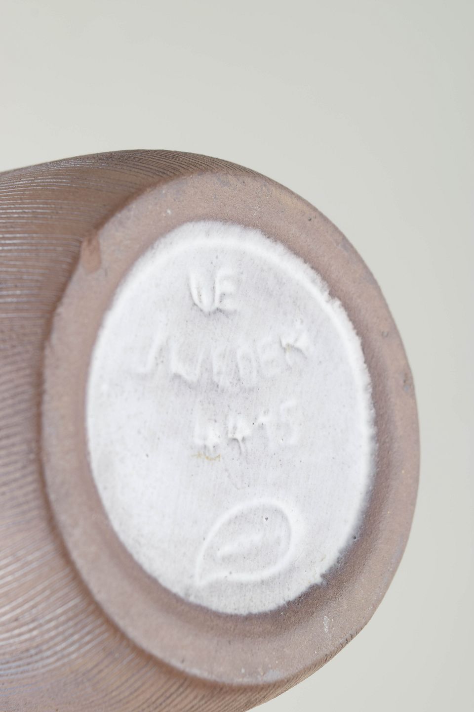 Dekorativ keramikvase med let asymmetrisk form og håndmalet geometrisk dekoration i pasteltoner af gul, rosa og mintgrøn på brun, indgraveret baggrund. Et klassisk eksempel på Simmulsons karakteristiske stil fra perioden med kombinationen af teksturerede overflader og bløde farver.
