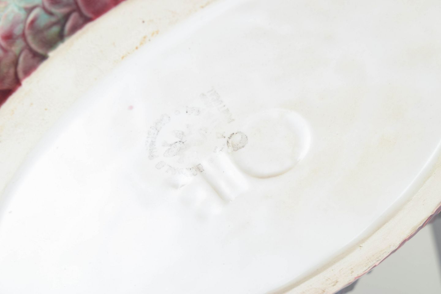 Dekorativ og humoristisk terrin formet som en fisk med låg og tilhørende ske. Håndmalet i levende nuancer af rød, grøn og grå, med fint modellerede detaljer i finner og skæl. Et karakterfuldt og sjældent serveringsstykke med både funktion og skulpturel tilstedeværelse.