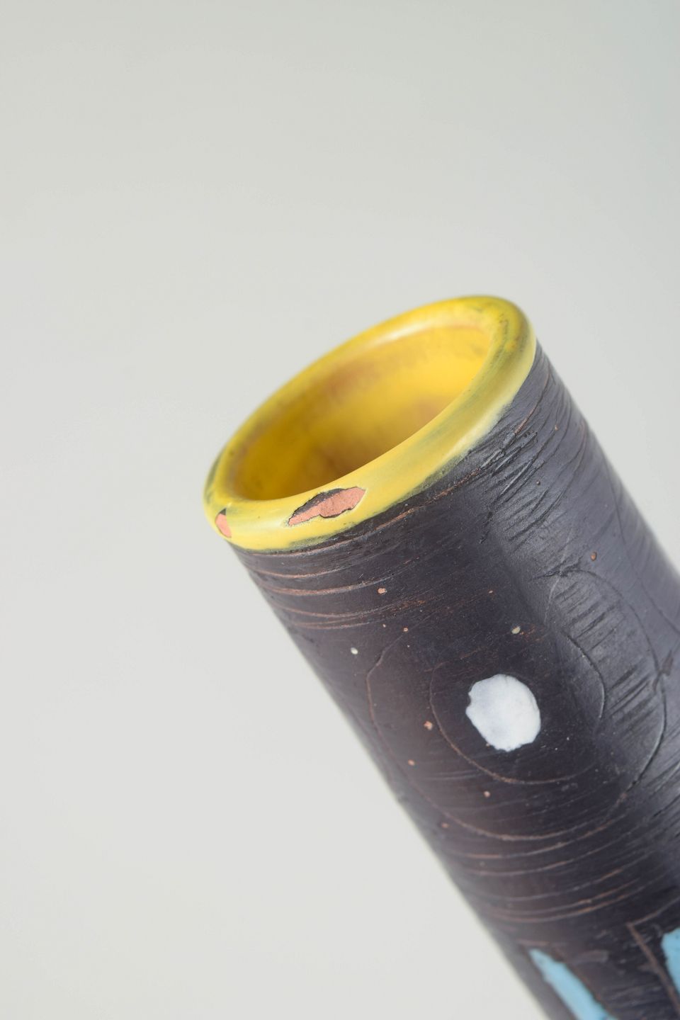Håndmalet keramisk vase med slank hals og dekorativt geometrisk mønster i sort, blå, gul og rød. Et karakteristisk eksempel på italiensk studiokeramik fra 1960’erne med livlige farver og grafisk udtryk.